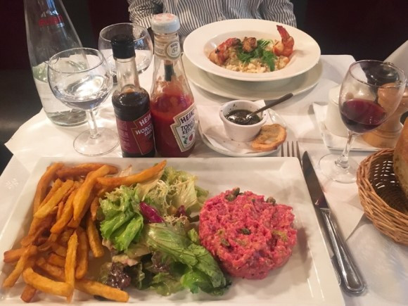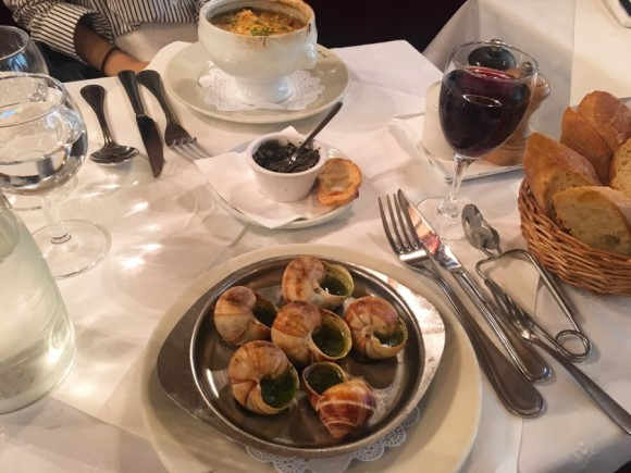 레스토랑에 들어서니 웨이터가 자리를 안내하며 메뉴판을 건네주었다. 메뉴판에는 애피타이저부터 스타터, 메인 디시, 디저트까지 빼곡히 쓰여 있었고, 우리는 어니언 수프와 에스까르고, 그리고 타르타르를 시켰다. 프랑스 하면 제일 먼저 생각나는 그런 음식들이었다. 글라스 와인도 빼놓지 않았다. 여행 첫날이기에 뭔가 축배를 들 것이 필요했기에!