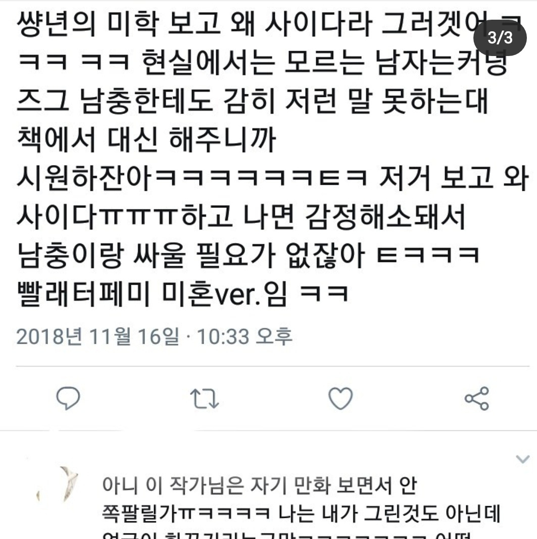 "네, 그렇게 느끼셨다니 다시 한번 유감입니다. 하지만 제 머리길이, 화장여부, 옷차림을 검열하고, 제 사진을 가져와 좆빨러라 칭하고, 메세지함을 열면 탈코 왜 안했냐는 DM과 지금 그쪽과 같은 멘션을 수십통을 받는 제 입장에서는 광기로 보이지 않겠습니까? 더군다나 그게 제가 페미니스트가 아닌 근거로 쓰인다면 말입니다. 아무리 타인은 절 오해할 권리가 있고, 전 해명할 이유가 없다지만 그 반응이 ‘실망했다’수준이 아니었다는 얘기를 지금 하고 있습니다. 저 때문에 소외감을 느끼셨다면 대단히 죄송하지만 이걸 굳이 뒤져서, 캡쳐해서 남겨둔 광기에 (수년째) 시달리는 제 생각도 해주시면 좋겠네요."