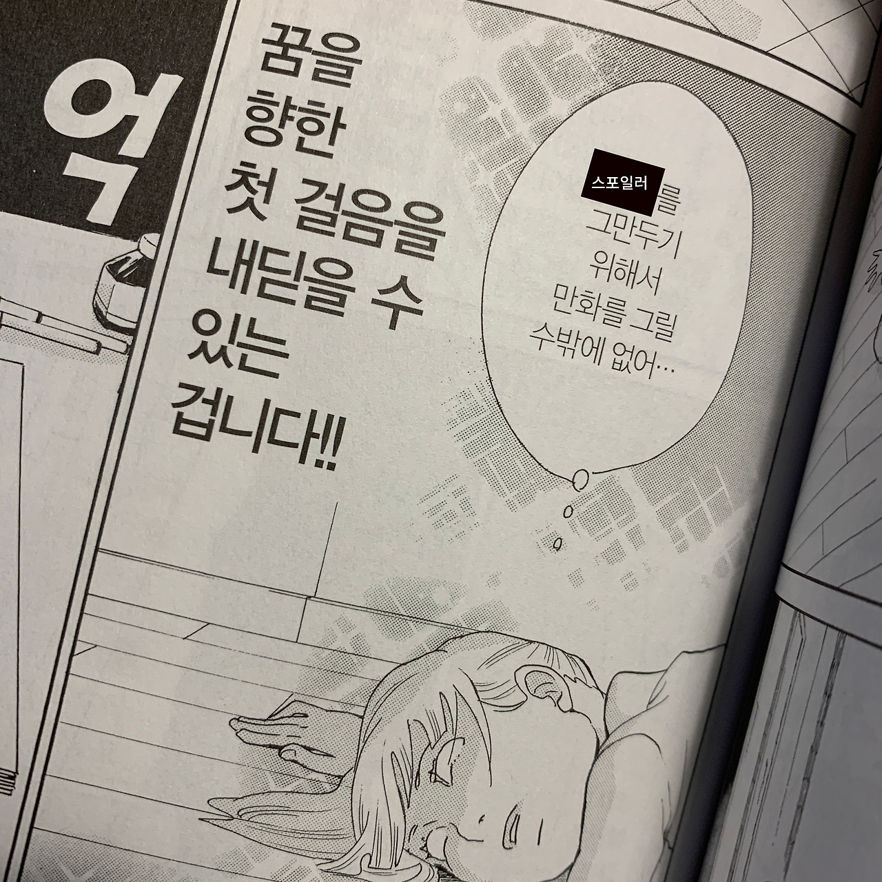 이제야 말하건대, 사실 마감 자체가 힘들지는 않았다. 콘티를 짜고, 대사를 쓰고, 그림을 그리는 과정은 퍽 즐겁기까지 했다. 하지만 그것과는 별개로, 이걸 하지 않는다면 먹고 살 수 없을지도 모른다는 위기감 같은 것에 늘 쫓겼다.