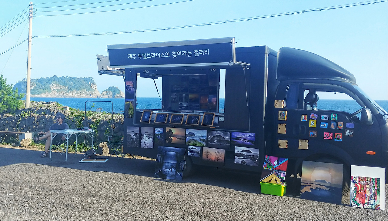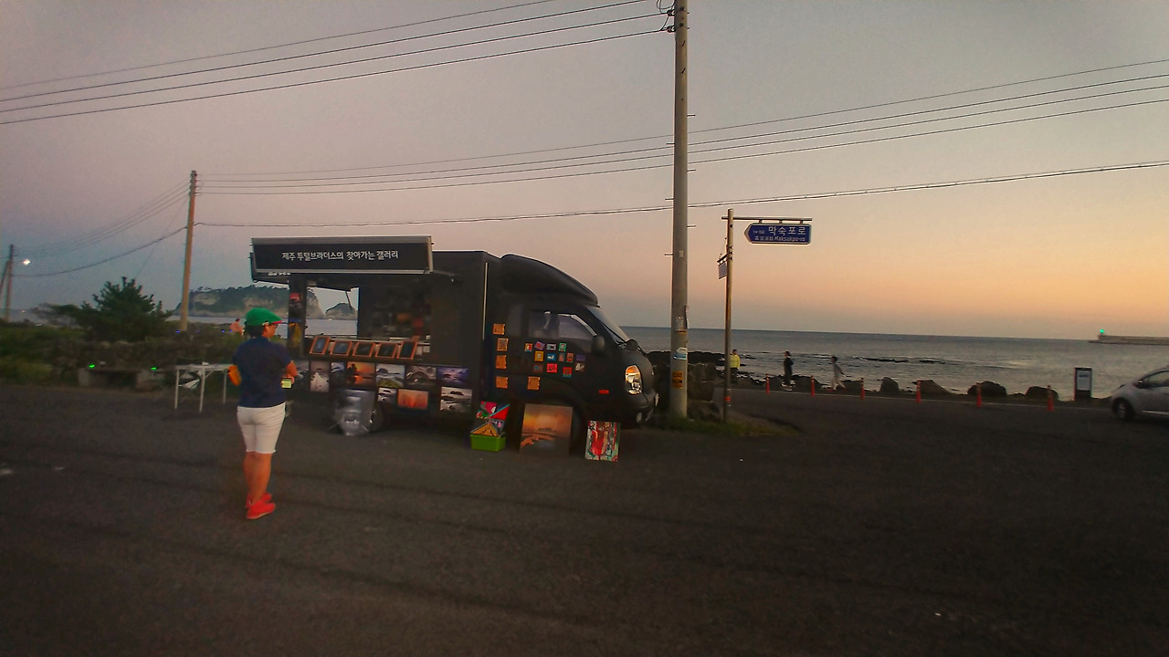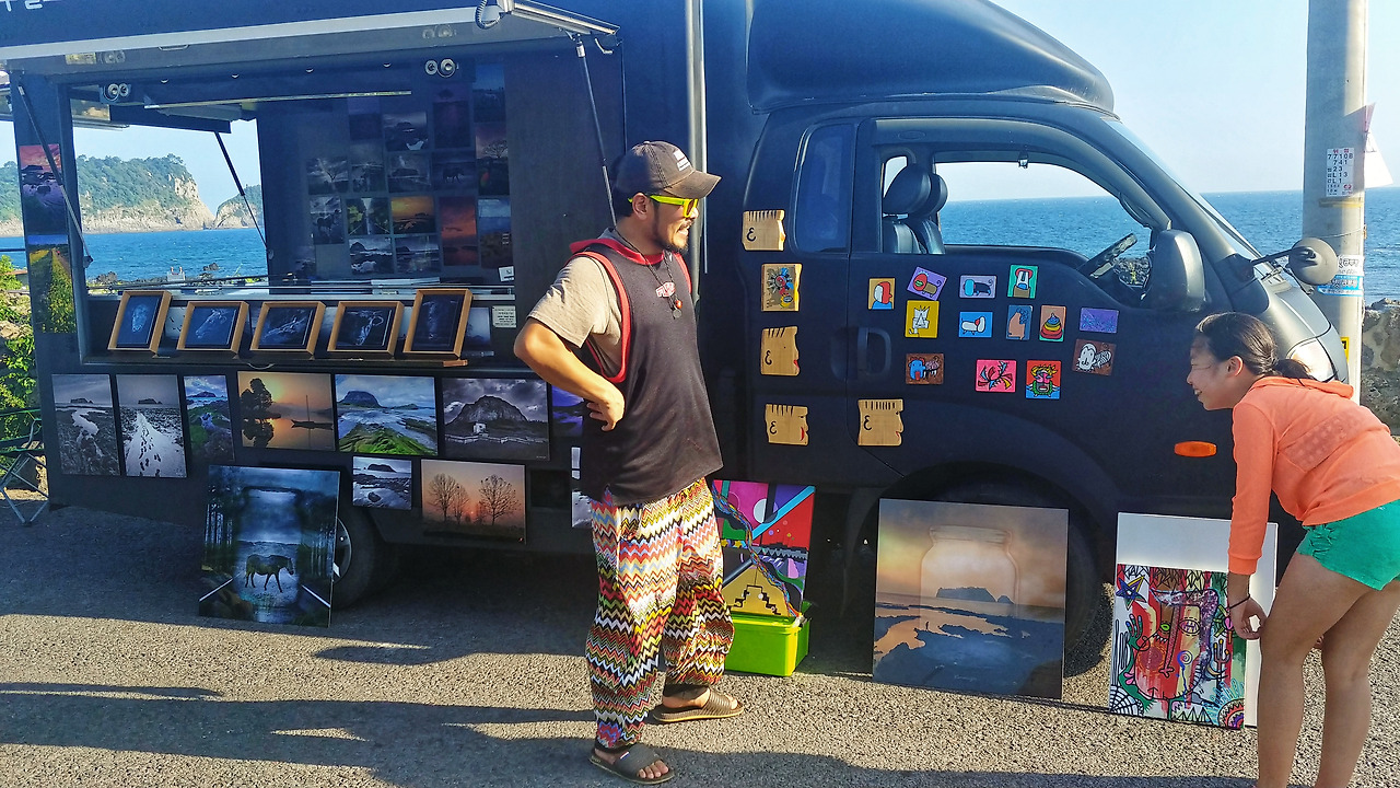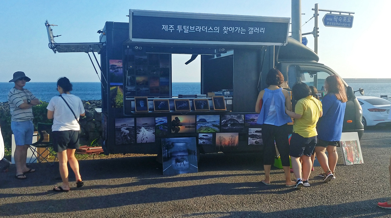 오늘도 우리를 알아보는 이가 있다. 이이는 ‘제주 한달살이’를 하다가 상주하고 싶어져서 여기서 취업을 하였단다. 퇴근해서 산책길에 우연히 우리 갤러리트럭을 보고 다가와 말을 건넨 것이란다. 그런데 이야기를 나누고 보니 지인의 지인이 된다. 제주는 큰 섬이지만, 조금 지내고 보면 한 다리 건너 아는 사람들이 된다. 인연이 인연으로 이어진다.