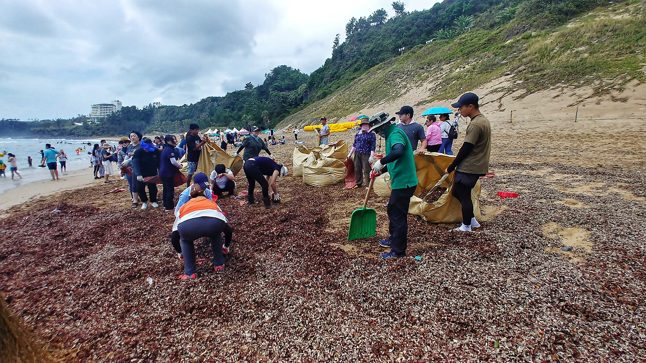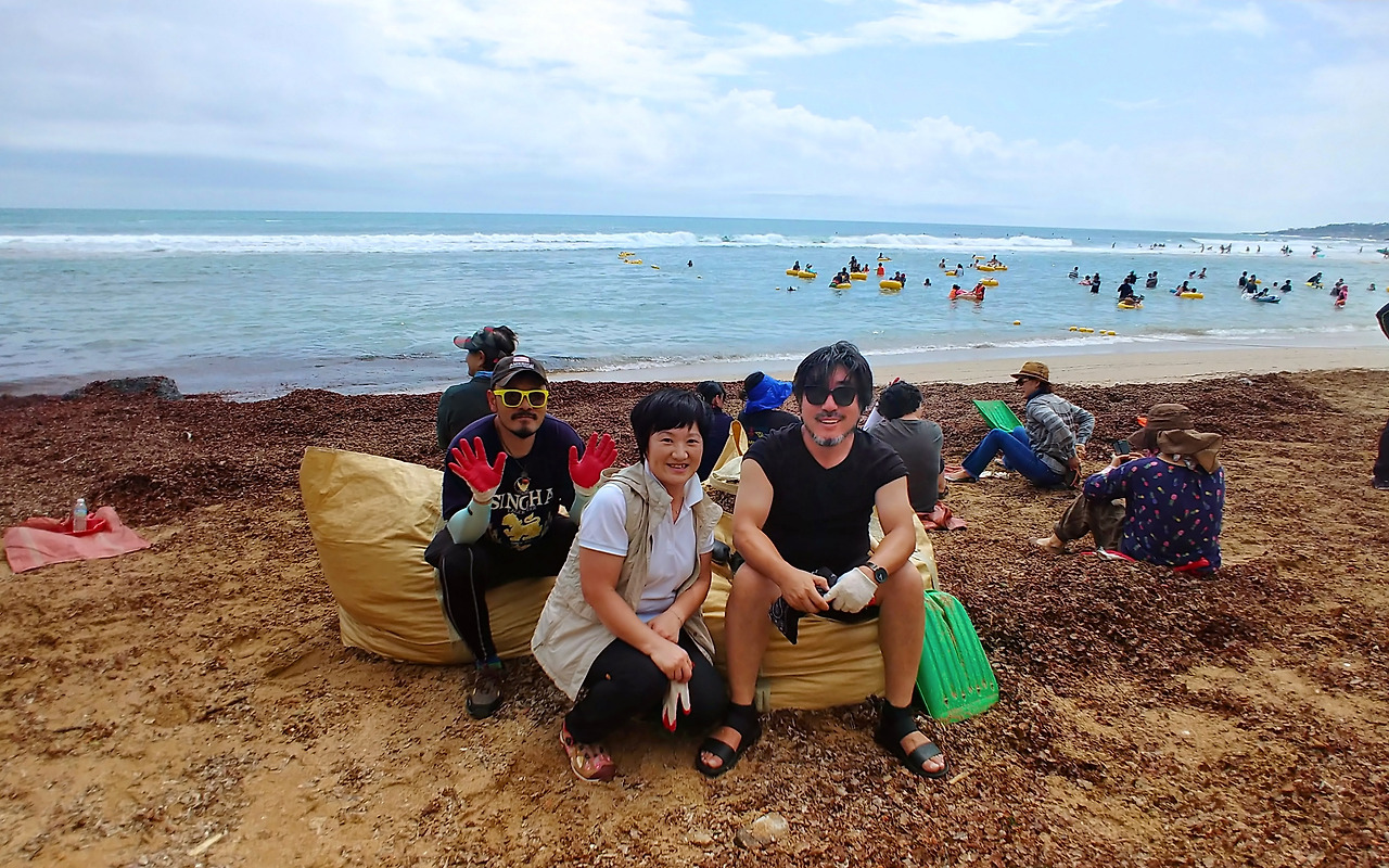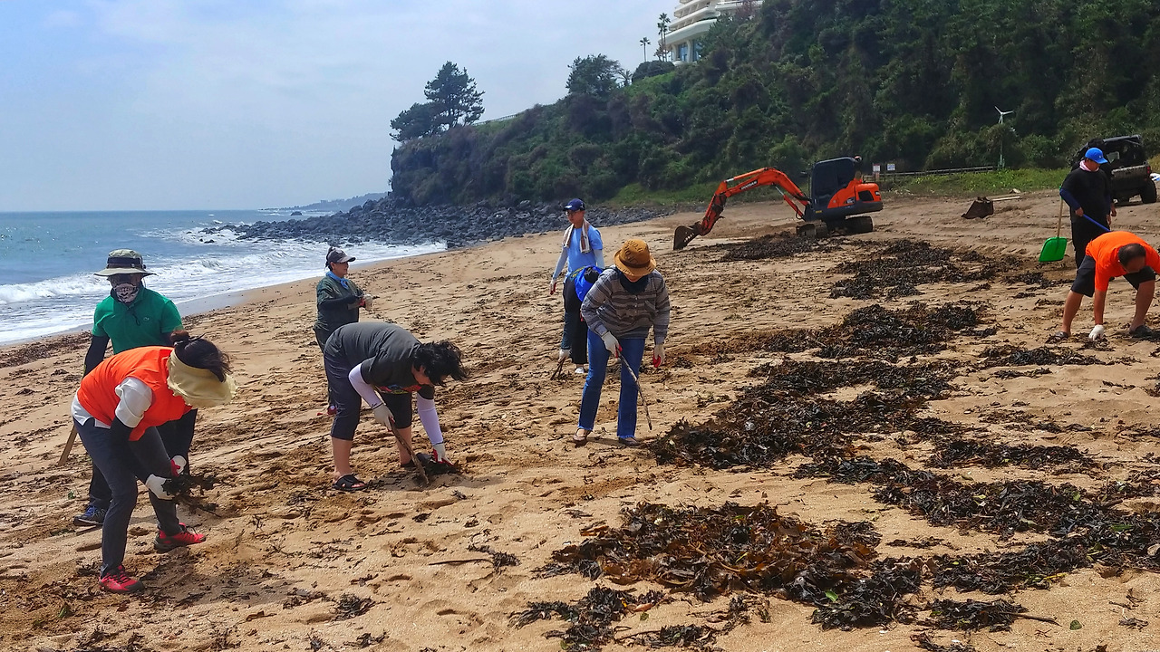 일은 비교적 수월했다. 태풍이 백사장에 흩뿌려 놓은 해초류를 거두어 마대에 담는 작업이다. 여전히 뜨거운 날씨이지만, 많은 일손이 함께하고 굴삭기까지 동원되니 금세 작업이 끝난다. 몸은 땀으로 범벅이지만, 마음은 즐겁다.