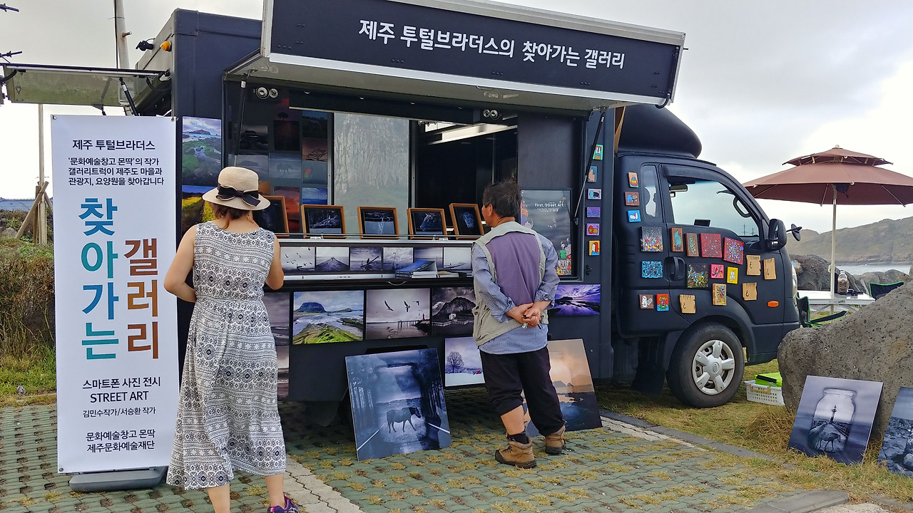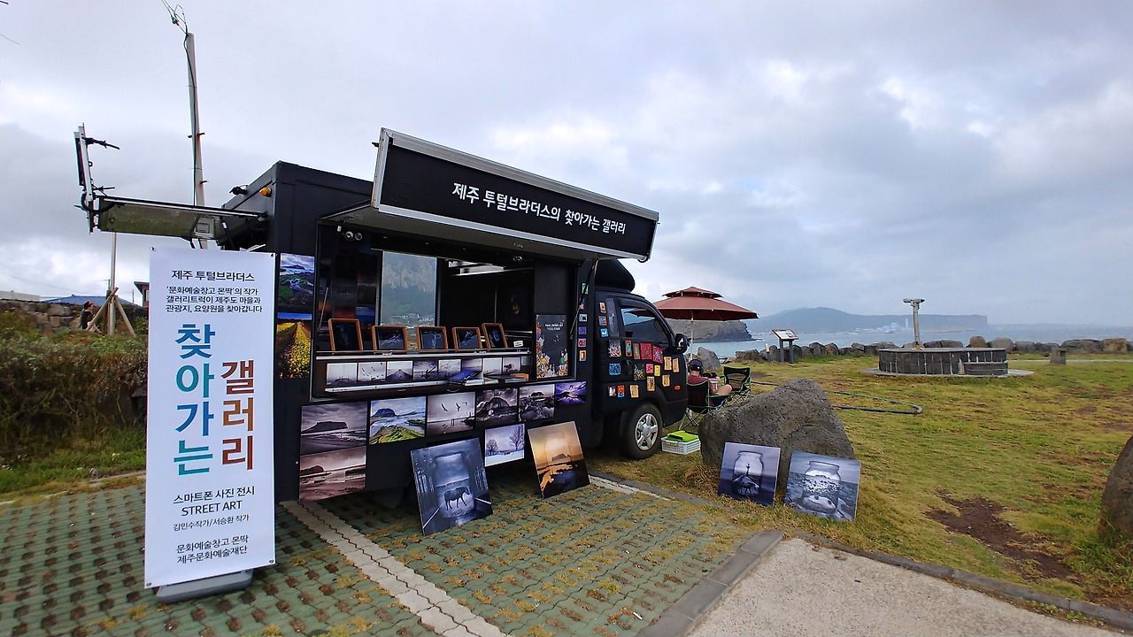 우리는 재빨리 전시 액자를 떼어 낸다. 갤러리트럭은 필요한 곳에 직접 찾아가 대중과 쉽게 소통할 수 있다는 장점이 있지만, 기상 조건에 바로 영향을 받는 단점도 있다. 오늘도 많은 일이 있었던 날이다. 제주살이를 하면서 부쩍 느끼는 것인데, 하루하루가 매일 다르게 펼쳐지는 드라마 같다.