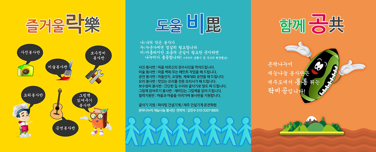 ‘몬딱나누미’의 슬로건은 즐거울 락(樂), 도울 비(毘), 함께 공(共)이다. 럭비공처럼 통통 튀며 즐겁게 재능을 나누고 서로 도와 가며 함께 제주를 살아가자는 뜻이다. 매월 1~2회 토요일에 봉사활동을 하기로 하였다. 내친김에 서귀포시 자원봉사센터에도 등록을 마쳤다.