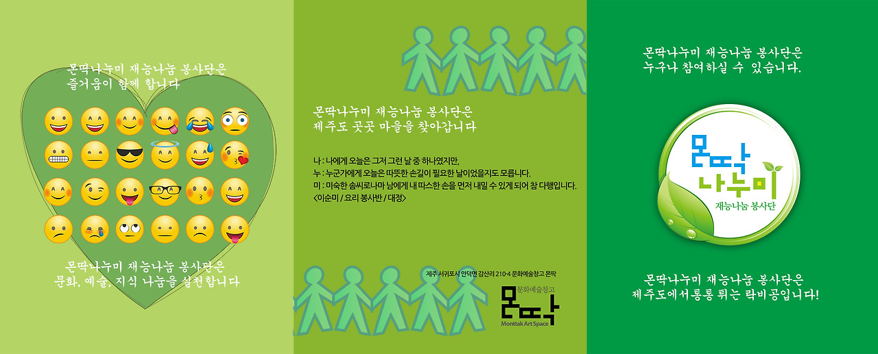 금요일 오후에 서귀포시시청 자원봉사센터에서 걸려 온 전화다. 나는 ‘문화예술창고 몬딱’을 만드는 과정에서 알게 되어 가깝게 지내는 이들이 여럿 있다. 얼마 전에 그들과 함께 각자의 재능을 나누어 지역사회에 보람 있는 일을 해 보자는 뜻으로 ‘재능나눔 봉사단’을 만들었다. 이름하여 ‘몬딱나누미’이다.
