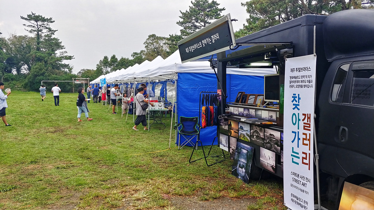 음악회 행사장은 한경면 조수1리의 한 폐교 운동장이다. 다행히 비는 잦아들었다. 많은 이들이 행사용 천막 설치와 공연 무대 준비로 여념이 없다. ‘찾아가는 갤러리트럭’은 늘어선 행사 천막들 앞쪽에 자리가 지정되어 있다. ‘플리마켓’ 용 천막이 즐비하다.