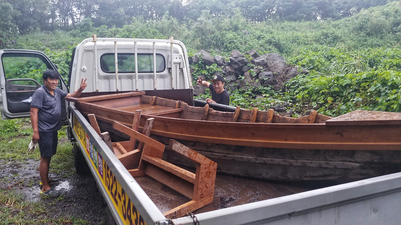 문제는 그 배를 옮기는 일이었다. 작은 배지만 성인 6명은 있어야 들 수 있고, 적어도 2.5t 트럭은 되어야 실어 나를 수가 있다. 게다가 배를 보관하고 있는 창고가 제주시 봉개동인데, 서귀포시 ‘문화예술창고 몬딱’과는 정반대 방향으로 차로 한 시간쯤이나 달려야 하는 곳이다.