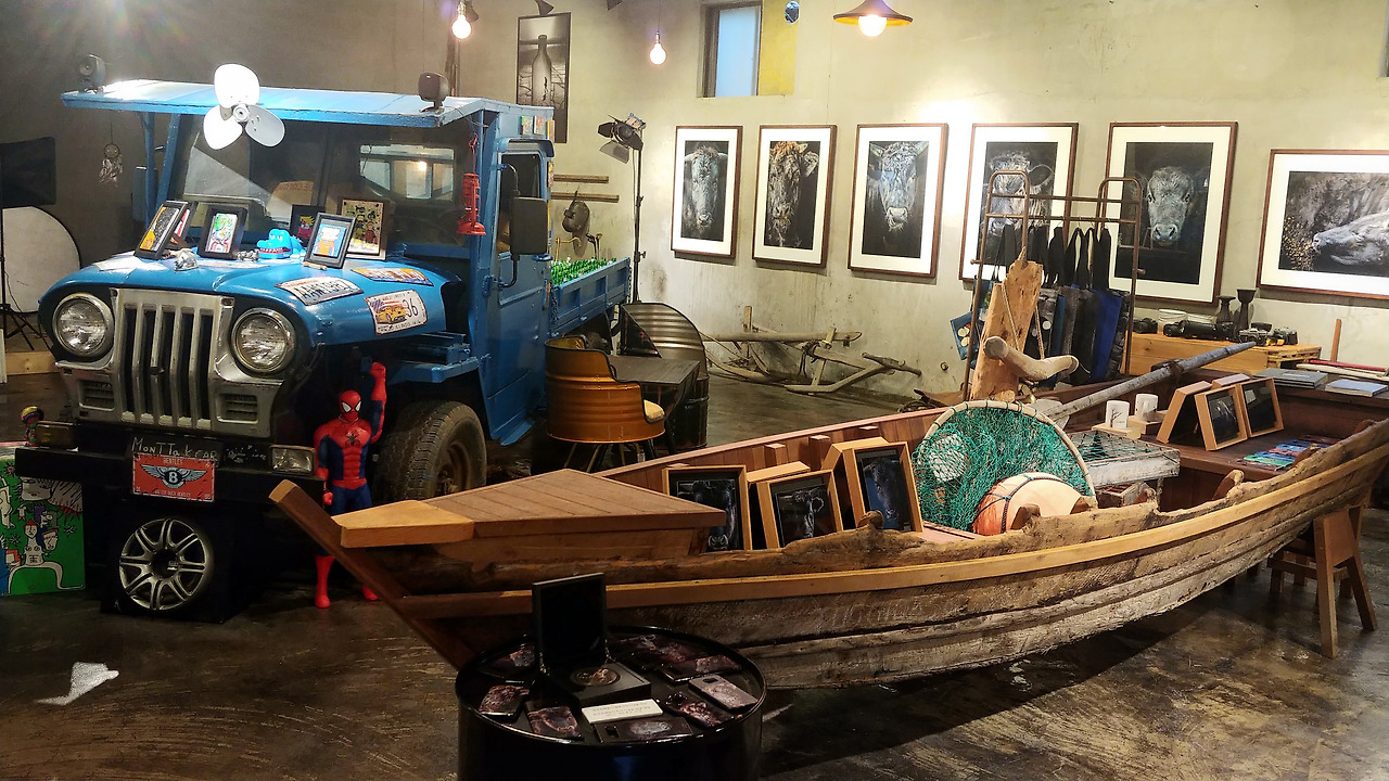 힘을 모으니 배가 들린다. 배를 창고에서 힘겹게 꺼내어 트럭에 올려 싣고, 한 시간을 달려, 드디어 ‘문화예술창고 몬딱’에 들여놓았다. 경운기트럭 옆에 함께 둔 낡은 배는 몬딱의 또 다른 이색 전시물이 되어졌다.