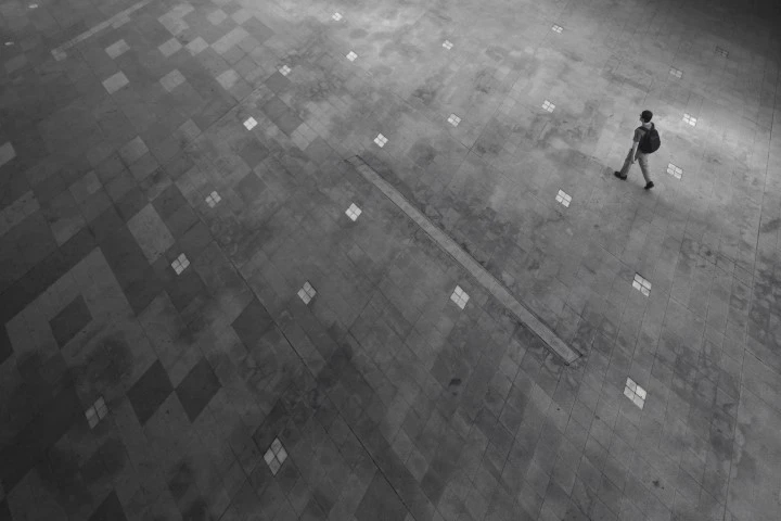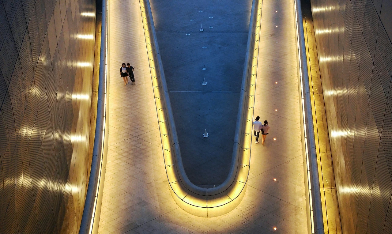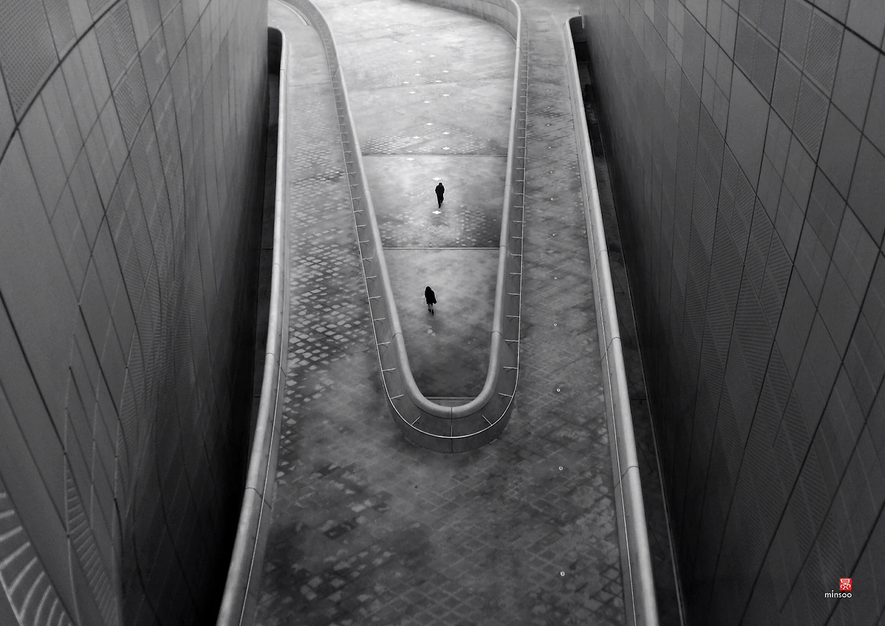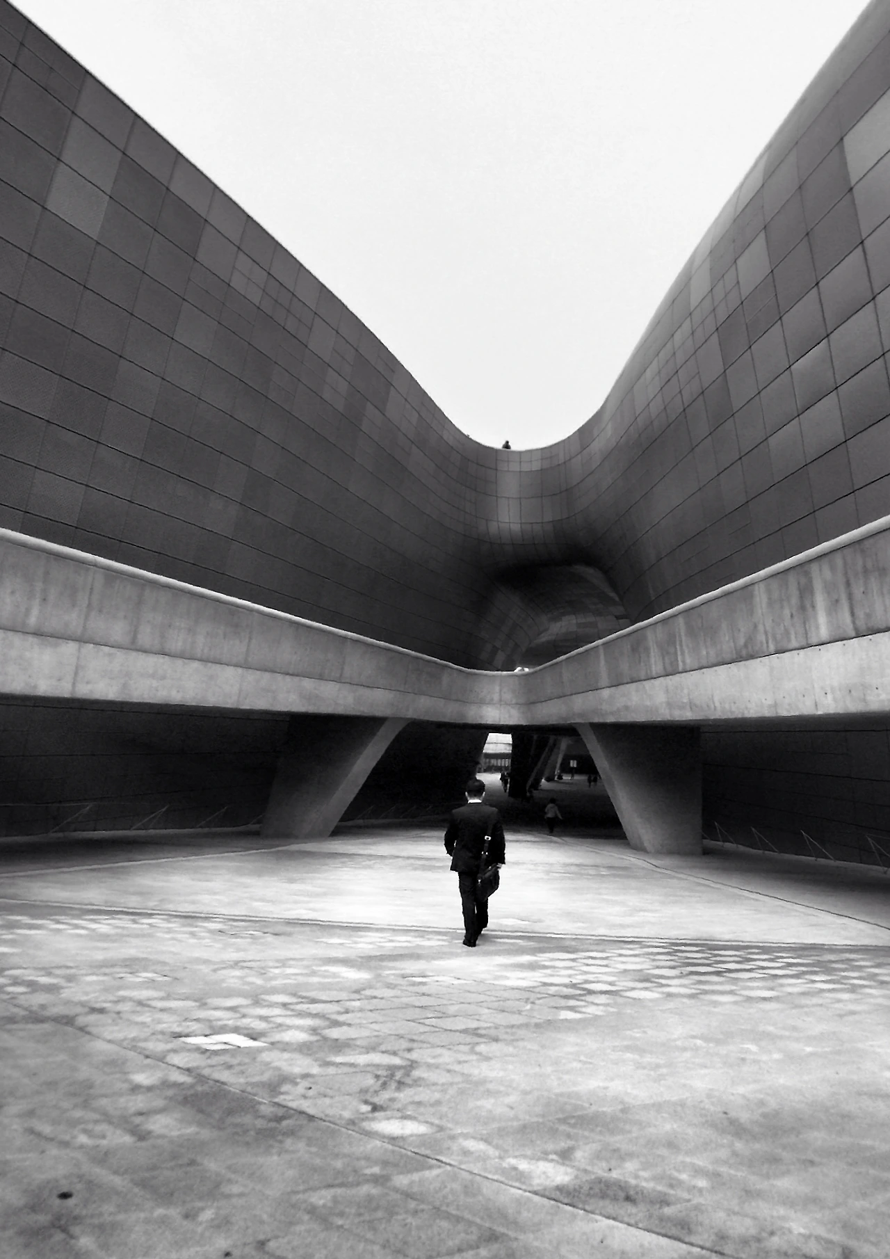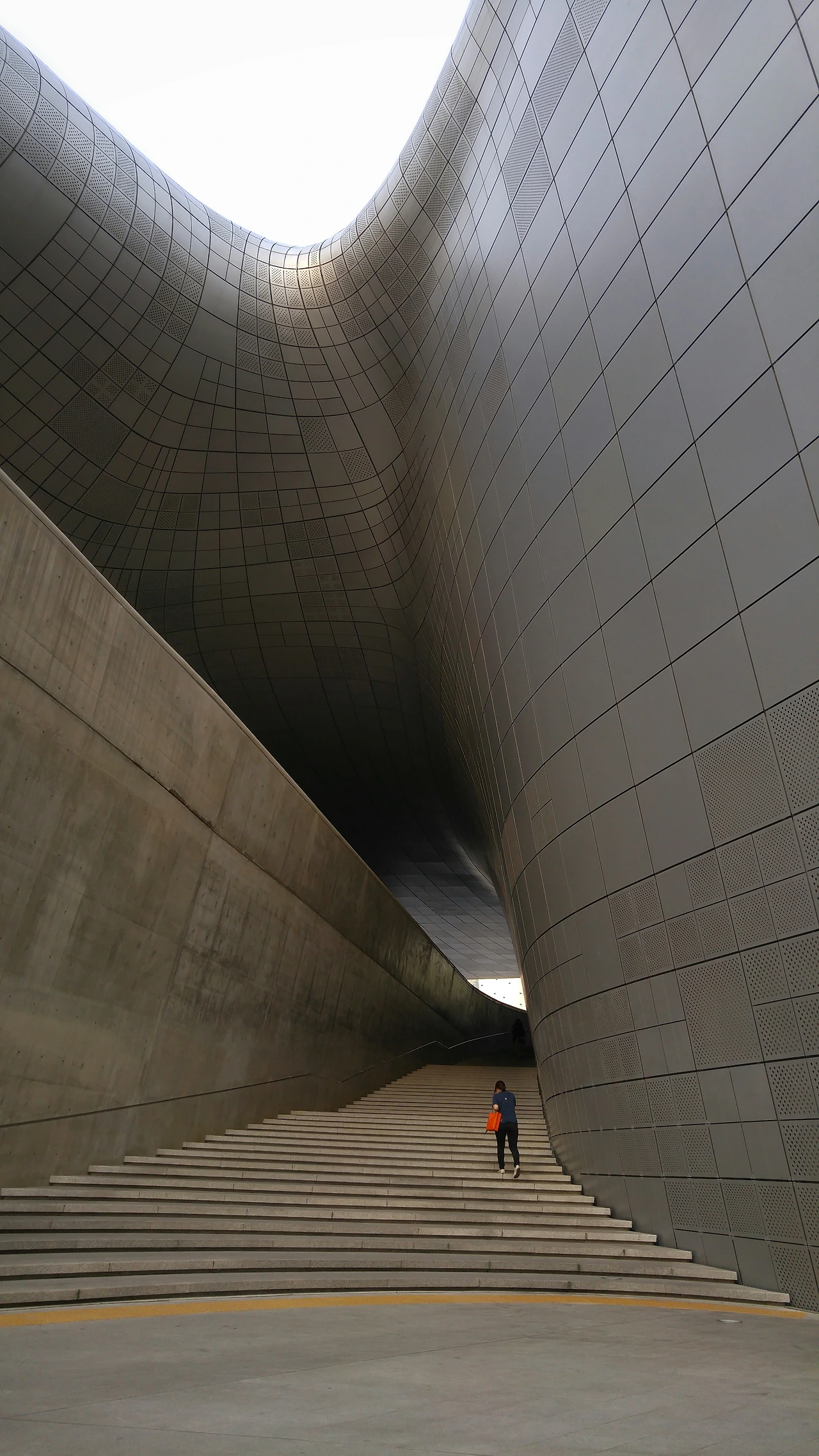 DDP의 가장 높은 곳으로 올라가면 아래 사진과 같은 사진 포인트를 찾을 수 있다. 이곳은 사람 가슴보다 높은 추락 방지용 벽이 쳐져 있다. 그러므로 눈을 카메라에 가까이 대고 찍어야 하는 DSLR 카메라는 다소 불편하다. 반면, 스마트폰은 양손으로 잘 잡고 펜스 밖으로 팔을 길게 내밀어 찍기만 하면 되므로 매우 편리하다. 이왕이면 사람들의 이동이 적은 이른 아침 시간에 한두 명의 사람이 지나갈 때를 기다려 찍는다면, 보다 예술적인 회색 도시 사진을 남길 수 있다.