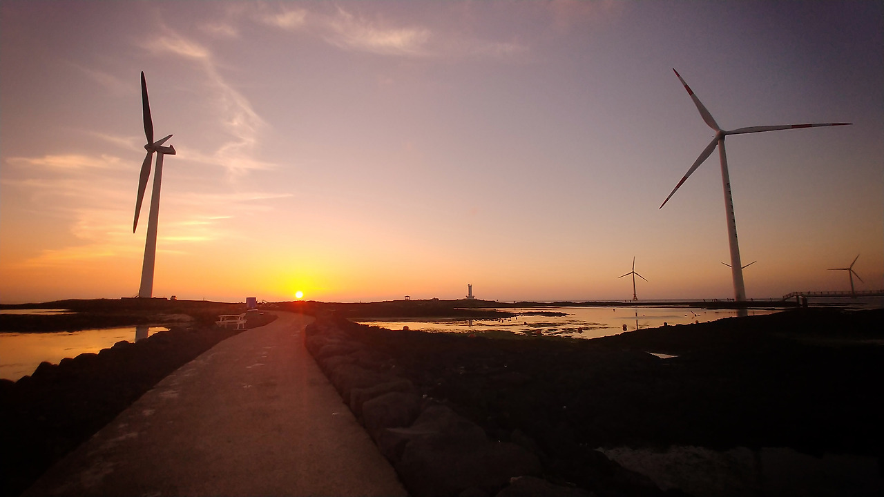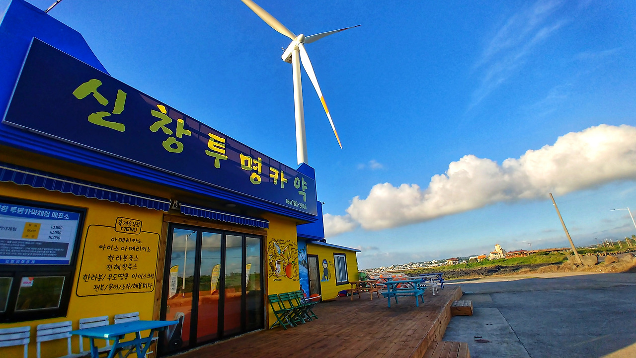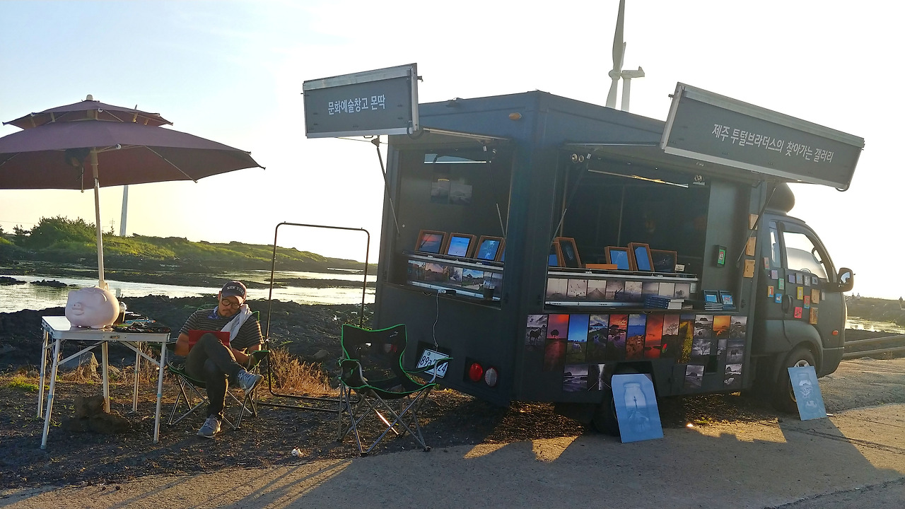 신창 해안에는 풍력발전기들이 위풍당당하게 서 있다. 이곳은 제주 서쪽으로, 해 질 녘 풍차와 어우러지는 노을이 참 아름다운 곳이다. 투털브라더스의 갤러리트럭은 오후 4시에 출발하여 8시쯤 철수하는 것으로 하고 짐을 챙겼다.