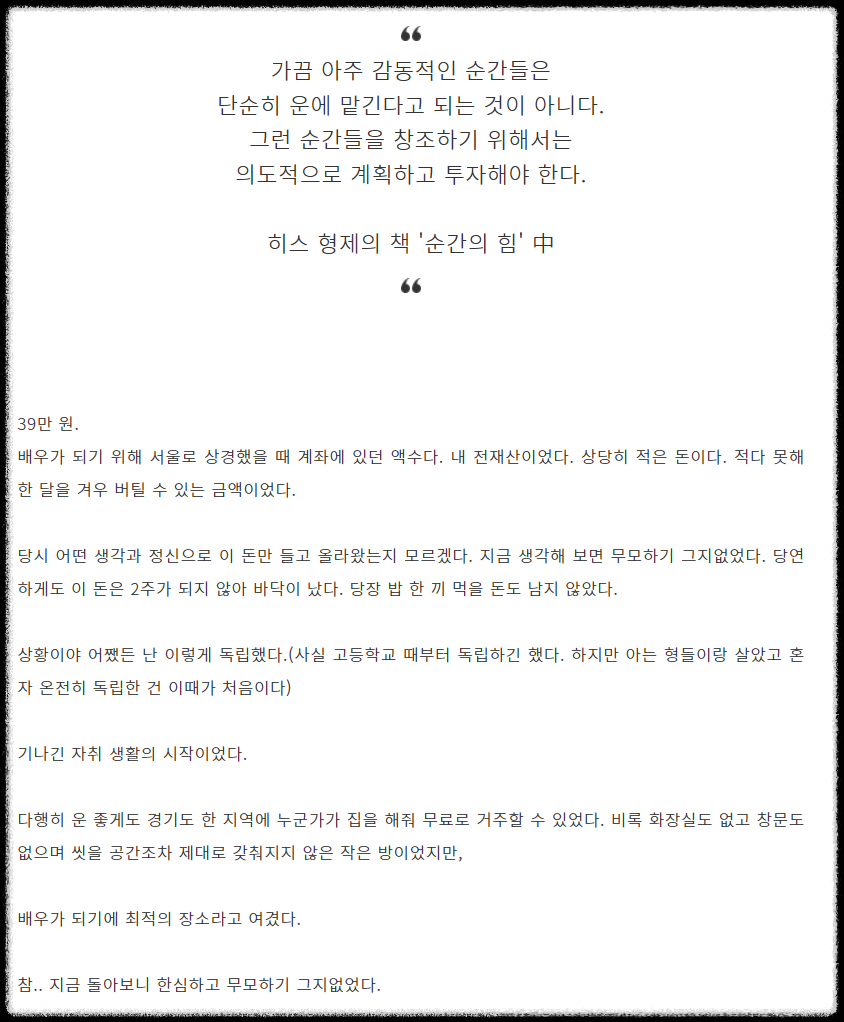 작가님은 브런치에 오신 지 채 한 달이 되지 않았다. 마치 우리 모두의 청년의 때, 그 어느 대목이 연상되고 공감되는 팩트와 기술에 눈이 머물렀다. 39만 원만 갖고 배우가 되고자 상경한 한 사람. 막막한 대해에 홀로 물살을 거스르는 배 한 척의 모습. 우리들의 젊은 날의 자화상이요, 오늘을 살아가는 매일의 얼굴이 아닐까.