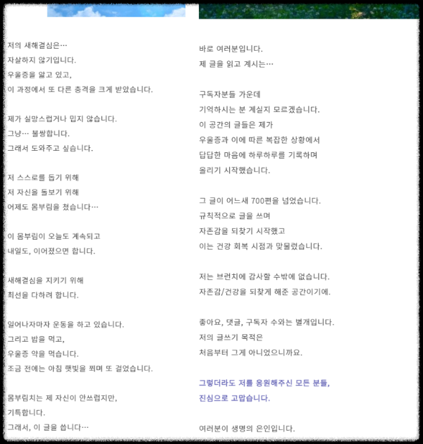 오시수 작가님은 2022년 1월 22일 당시 ㅈㅅ충동과 우울증을 앓고 있었다고 한다. 그러나 브런치에 매일 글을 올리고 운동기록을 남기면서 점차 회복되어 갔다. 2023년의 10월 9일에는 브런치 구독자분들을 은인이라 지칭하며, 그간의 마음의 재활과 치유 경과를 나눠 주었다. 죽음의 문턱에서 바둥거리던, 브런치를 병원 침대 삼아, 매일 써오면서 잔잔히 남긴 글들이 청아한 함성 같은 응원을 전해 주는 것 같았다.