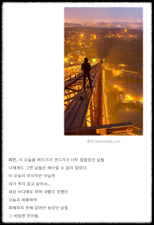 그렇죠? 저도 라이킷, 댓글 일명 품앗이라는 묘한 기조가 처음엔 인위적이라 거부감이 들려 하더라구요. 그런 게 꺼려져서 페이스북이나 여타의 SNS도 하다가 개점 폐업상태거든요. 뭔가 포장해서 나를 보여야 하는, 일종의 '쇼윈도 삶' 같다랄까요.