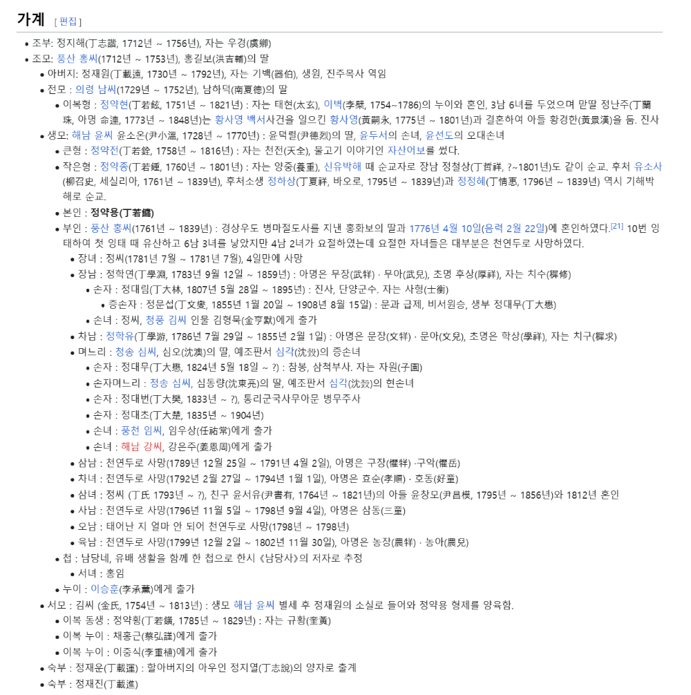 본관은 압해(押海)였다. 지금은 전라남도 신안군에 속하는 섬이지만 조선시대에는 나주목에 속해있었기에 나주 정씨로도 불렸다.[12] 조상들은 고려 말에 황해도 배천에 살다가 조선이 개국하자 서울로 이주했다. 11대 조부 정자급(丁子伋)이 승문원 교리를 지낸이래 8대에 걸쳐 벼슬을 하였다. 홍문관 부제학을 지낸 정수강, 병조 판서를 지낸 정옥형, 의정부 좌찬성을 지낸 정응두, 대사헌을 지낸 정윤복, 강원도 관찰사를 지낸 정호선, 홍문관 교리를 지낸 정언벽, 병조 참의를 지낸 정시윤이다.[13] 8대 조상이 연이어 모두 홍문관 명부에 이름을 올렸는데, 홍문관은 사헌부, 사간원과 함께 삼사(三司)로 불린 중요부서로 학문이 높은 학자관료만 들어갈 수 있었다.[12]