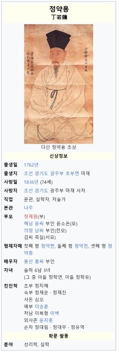 정약용(丁若鏞, 1762년 ~ 1836년)은 조선 후기의 문신이자 실학자·저술가·시인·철학자이다. 본관은 나주, 아명은 귀농(歸農), 자는 수시(美庸), 호는 다산(茶山)·사암(俟菴)·탁옹(籜翁)·태수(苔叟)·자하도인(紫霞道人)·철마산인(鐵馬山人)·문암일인(門巖逸人), 당호는 여유당(與猶堂)이며, 시호는 문도(文度)이다.[1][2]IASB 2012년, 다산 탄생 250주년을 맞아 '2012년 유네스코 세계기념인물'로 선정되었다.[3]