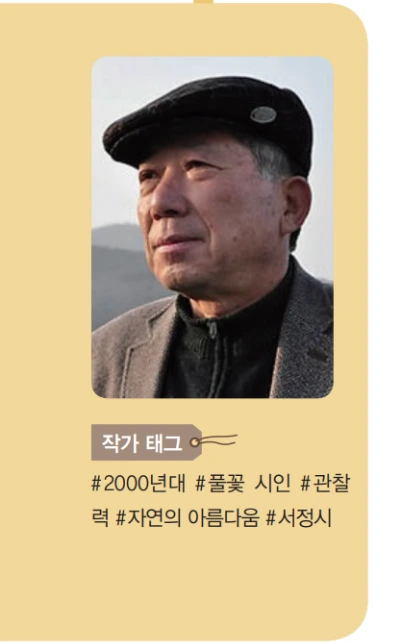 나태주는 1945년 충남 서천에서 출생하여 공주대학 사범대를 졸업하고 오랫동안 초등학교 교사로 재직했다. 1971년 《서울신문》 신춘문예에 <대숲 아래서>가 당선되면서 본격적인 문단 활동을 시작하였다. 나태주는 박목월의 제자로 두 사람의 인연이 깊다. 길에서 만난 중매쟁이의 소개로 현재의 부인을 만나 결혼을 하게 되었는데, 이때 박목월이 주례를 섰으며, 첫 시집의 서문도 박목월이 써 주었다. 교직에서 평생을 아이들과 보내서인지 그의 시는 어린아이의 마음을 담고 있다. 일상 속에서 사람들이 좀처럼 눈여겨보지 않는 주변의 사물에 세심한 눈길을 주고 소중한 의미와 가치를 발견하는 데는 초등학교 교사로서의 경험이 큰 몫을 했을 것으로 보인다. 많은 사람에게 위로가 되어 주는 대표작으로, 무엇이든 관심을 두고 깊이 들여다보면 소중한 존재가 되고, 그 진면목을 알 수 있음을 노래한 <풀꽃>은 그의 시업의 결정(結晶)이다. 그는 자신의 시를 가져와서 평가해 달라는 중년의 남자에게 이렇게 답해 주었다고 한다. “시는 왜 쓰세요? 시는 그냥 가만히 있다고 해서 나오지 않아요. 자기 마음을 들여다보고 만물을 하나하나 다른 시각으로 바라볼 때 좋은 시가 나올 수 있어요.”