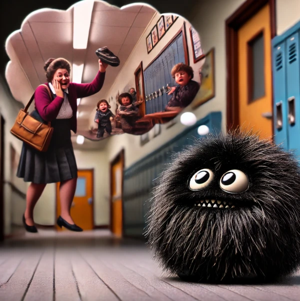 어느 초등학교 교실밖 복도 한복판. 신주머니를 잃어버린 초등학교 1학년 아이가 당황해 찾고 있어. 근데 커다란 가방을 든 심술궂은 선생님이 나타나 다그치는 거야.