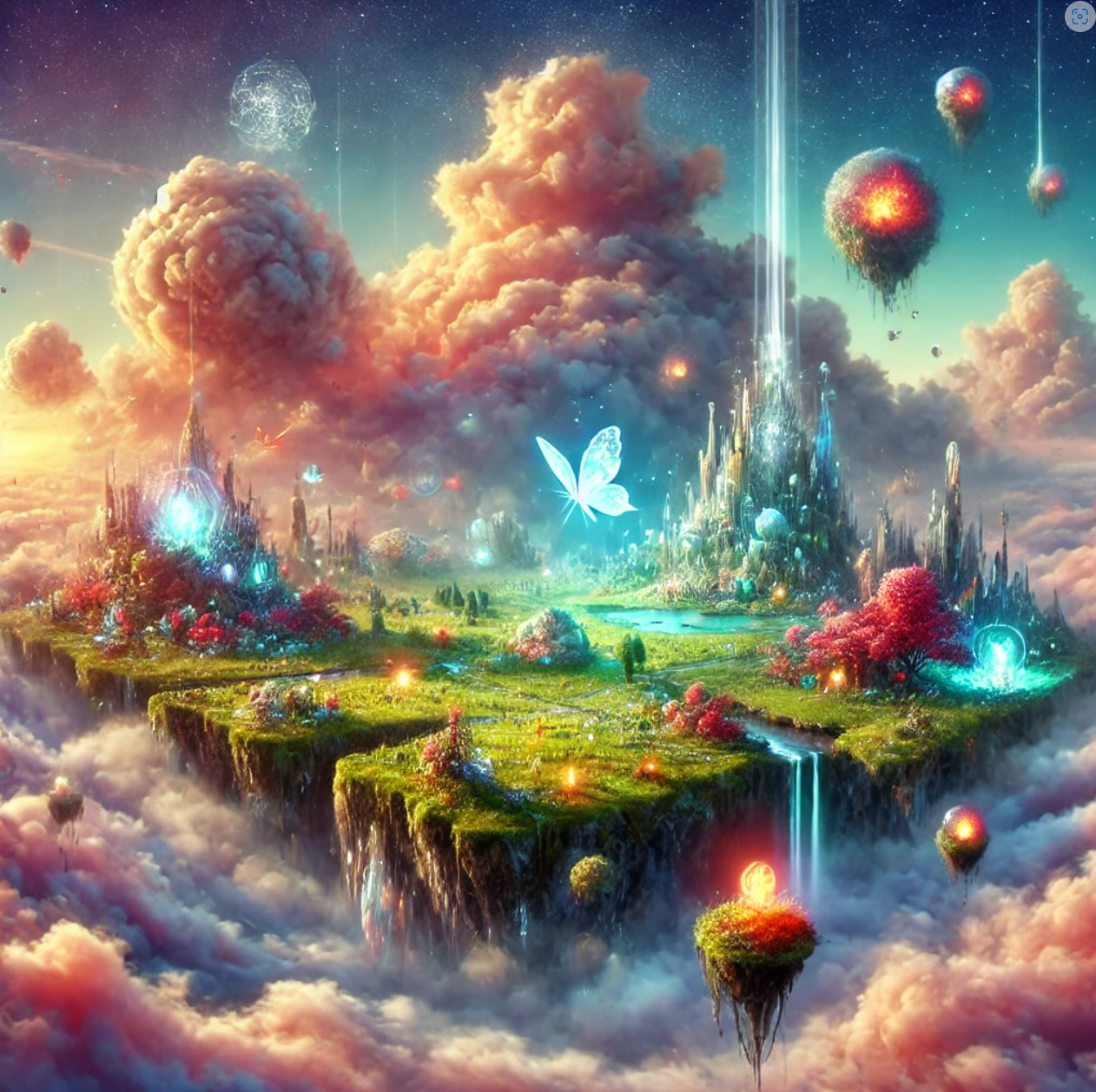 구름 위에 떠있는 거대한 지층은 마치 수박에서 잘려 나온 사각뿔 조각 같았다. 아래쪽엔 고구마처럼 투박한 암석과 흙덩어리들을 주렁주렁 매달고 있었다. 축구장 잔디밭처럼 파릇한 녹음이 대지를 뒤덮고 있는가 하면, 사방으로 쏟아내는 폭포수는 구름에 떨어질 때마다 사탕 알갱이를 공기 중으로 품어냈다. 요정들은 그 사탕 알갱이를 채집해 손위에서 입김을 불며 흔들어 댔는데, 그럴 때면 알사탕은 이내 솜사탕으로 변했다.