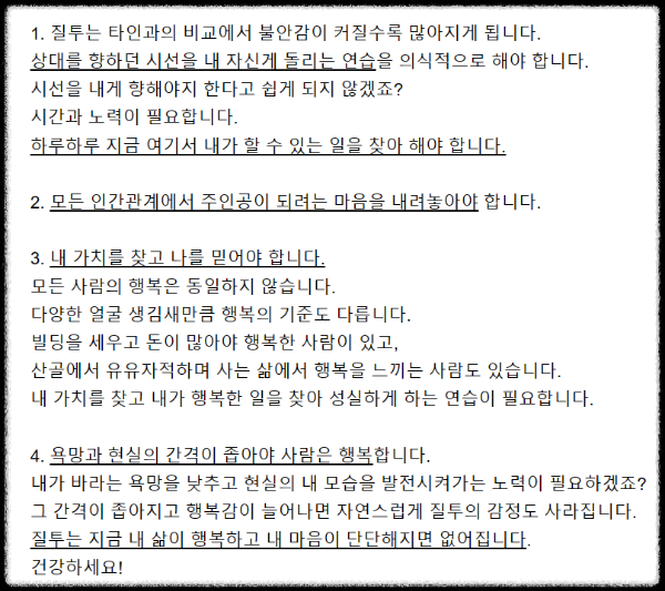 바닥에서 입지전적으로 성공한 공주 신드롬의 주인공이었던 신데렐라. 그녀는 혼자 궁궐 자기 침실에서 지내는 시간이 많아지면서, 자신 안에 전에 없이 무서운 감정이 싹트는 것을 느꼈다. 그녀는 더 이상이 착하고 불쌍한 신데렐라가 아니었다. 계모와 언니들 밑에서 구박 받으며 살았기에, 백성공주의 마음과 형편을 더 잘 헤아리고 보듬을 수 있으련만. 미워하면서 배운다고, 더 지독한 계모로 돌변한 것이다. 바로 "질투"라는 바이러스가 신데렐라의 심장을 정조준해 타격한 것이다.