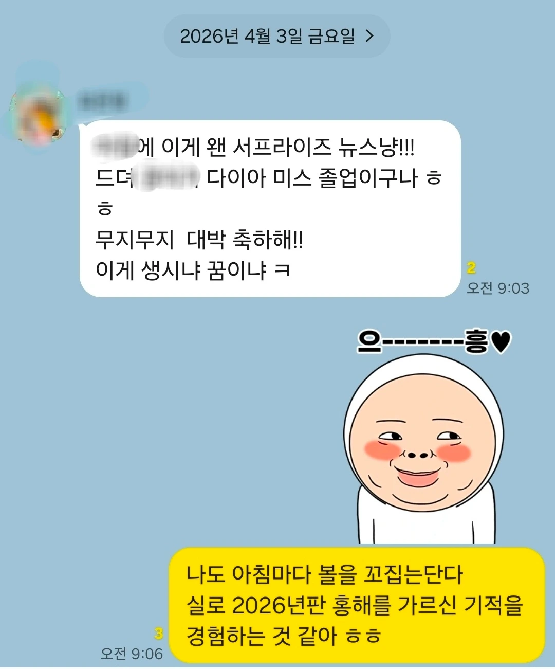 내가 속한 교회 모부서 소그룹 단톡방에만 우선 알렸는데, 김OO 집사님이 대놓고 "부럽다"며 솔직한 질투심을 토로하셔서 저를 살짝 당황스럽게, 또 감사하게 만드셨지요. 함께 사신 부군께서 요즘도 툭하면 "버럭!" 하신다며 귀여운 하소연을 하시더군요. 참고로 집사님은 30년차 기혼자이십니다. (ㅋㅋㅋ) 김 집사님이 늦깎이 신입 신부를 그만 부러워하시도록, 하나님께서 남편분의 그 '버럭'을 좀 고이 재워주시길 저도 함께 기도한답니다.