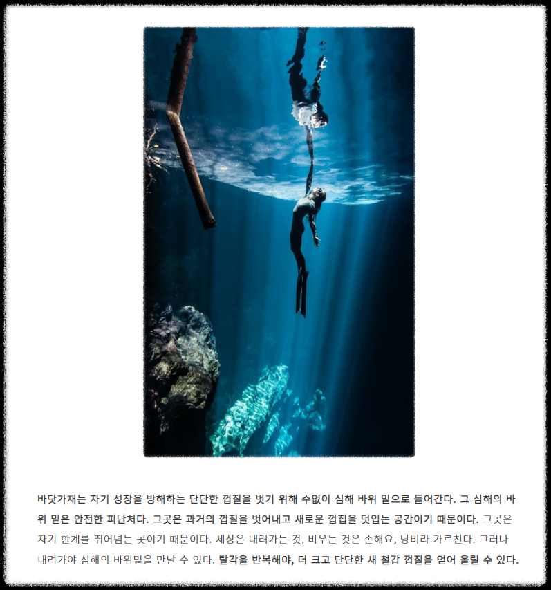 올해도 한해의 중반을 넘었다. 남아있는 달력의 장수만큼이나 아쉬움과 조바심이 날 수 있는 계절이다. 그런 가을에 채우고 채우는 삶과 더불어 덜어내고 빼는 삶. 마이너스 미학에도 심취해 보면 어떨까. 바닷가재가 새로운 껍질을 길어 올리기 위해 단단한 과거의 껍질을 덜어냈듯이. 처음을 힘입어, 저 마음의 심해에 맞닿기까지 내면의 탐험을 시작해 보자.