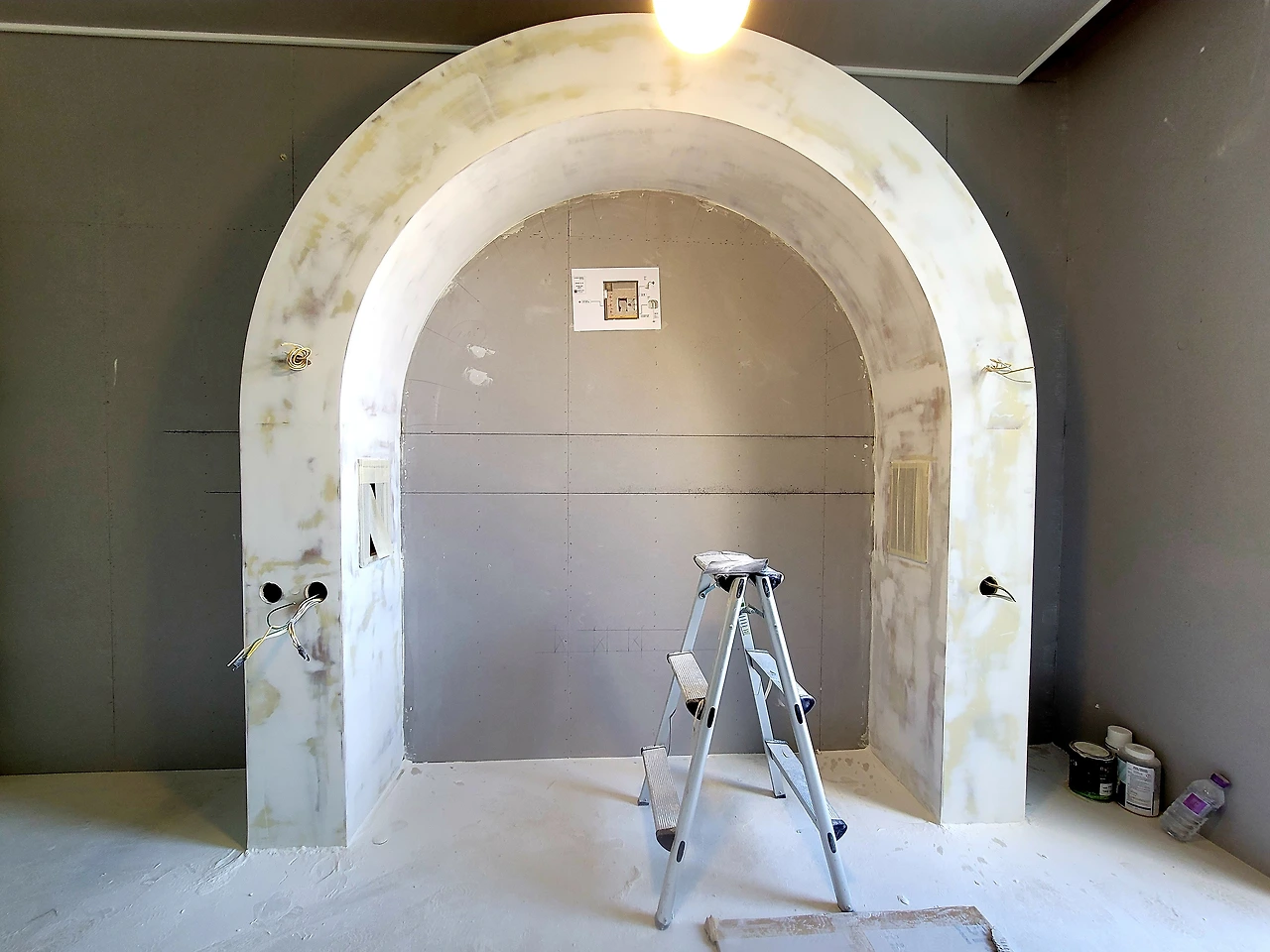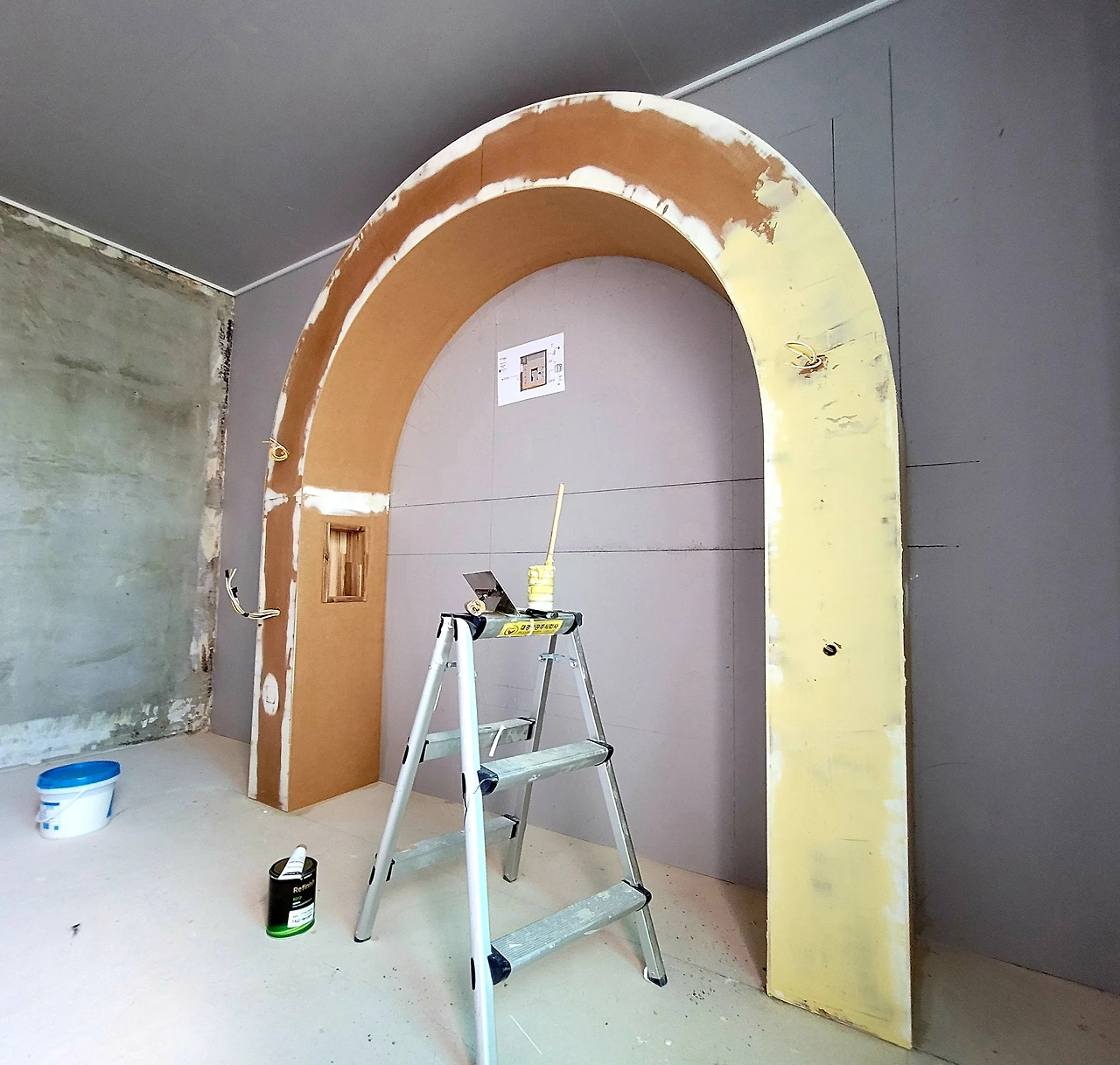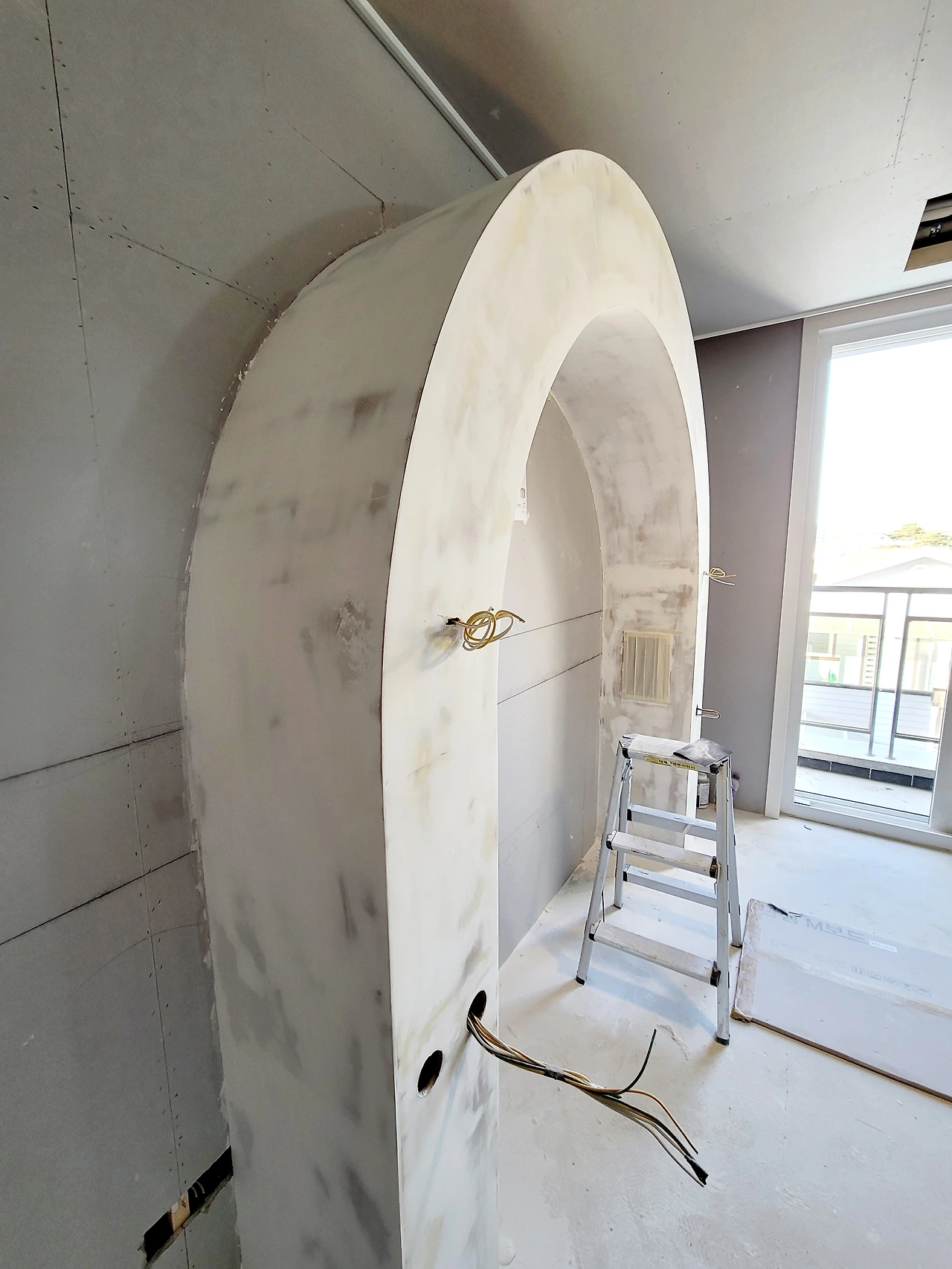 MDF로 제작된 목공 아치에 핸디 작업을 하고, 포리 퍼티 작업을 하는 중이다. 경화제를 섞어 하는 포리 퍼티는 완벽한 코팅층을 만들어 준다.