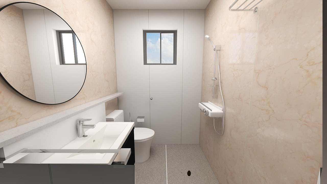 좁은 욕실이었기 때문에 더 더 젠다이를 조적하여 세면대를 사용할 때 선반사용으로 상부 공간에 여유를 두었으면 했고, 욕실을 정면에서 보았을 때 시각적으로 넓어 보일 수 있도록 벽 패널 색상 배치를 다르게 설계해 착시효과를 주었다.