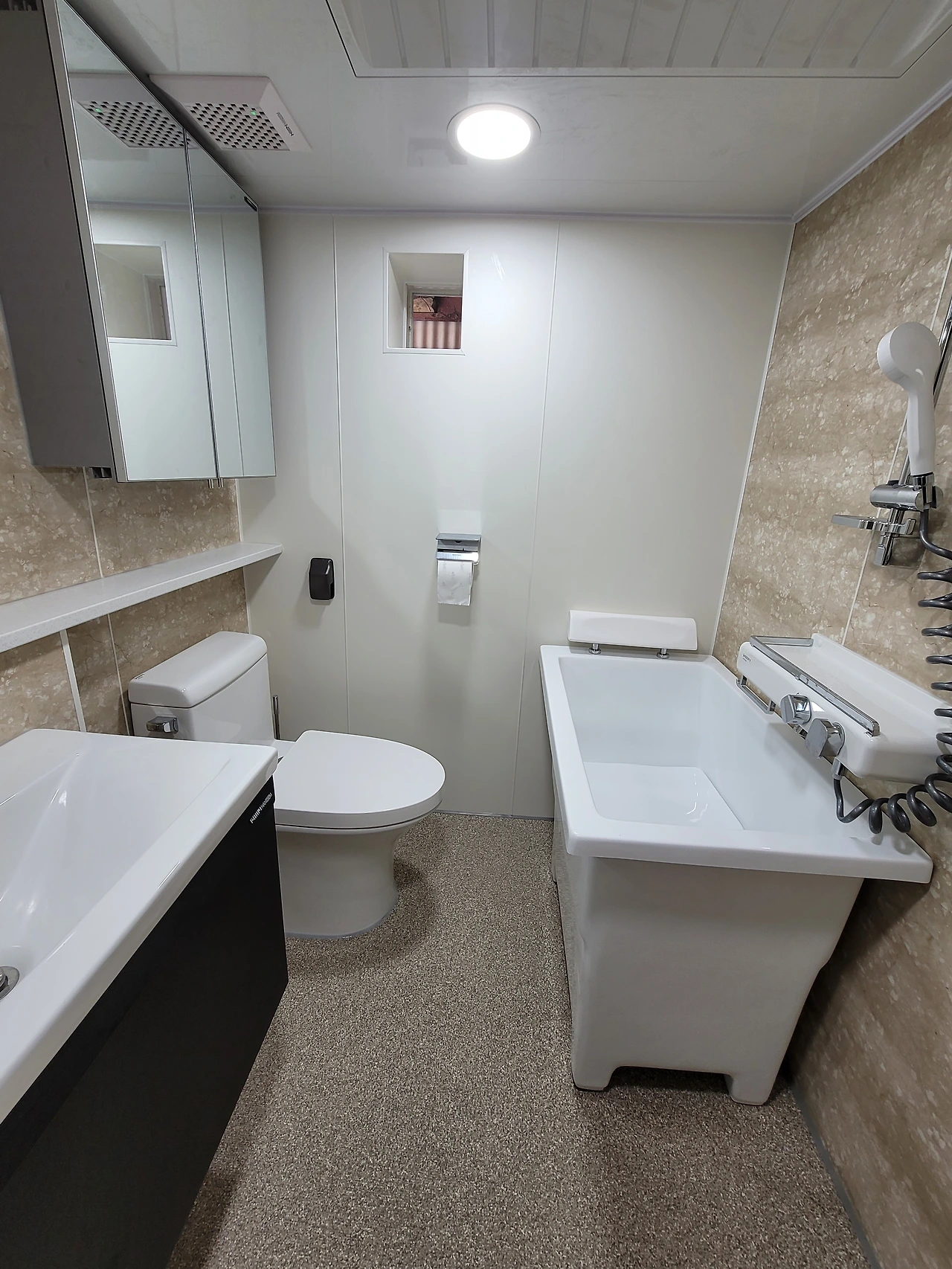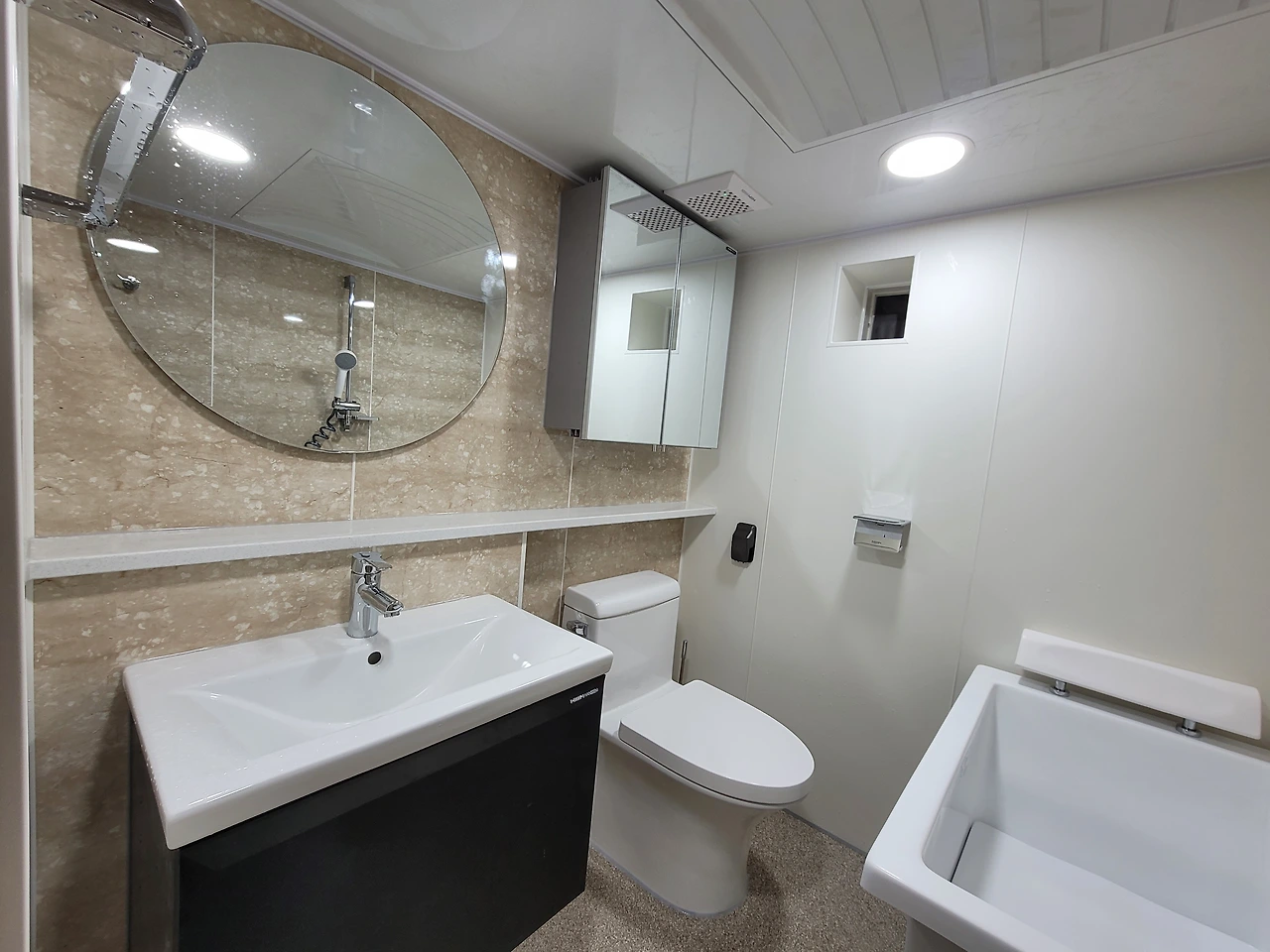 사용후 건조가 빠른 이 욕실은 바닥자재는 엠보가 있어 미끄러지지 않아 낙상의 위험도 적고, 슬리퍼를 신지 않고 사용할 수 있어 위생적이고 편리하게 사용할 수 있다.