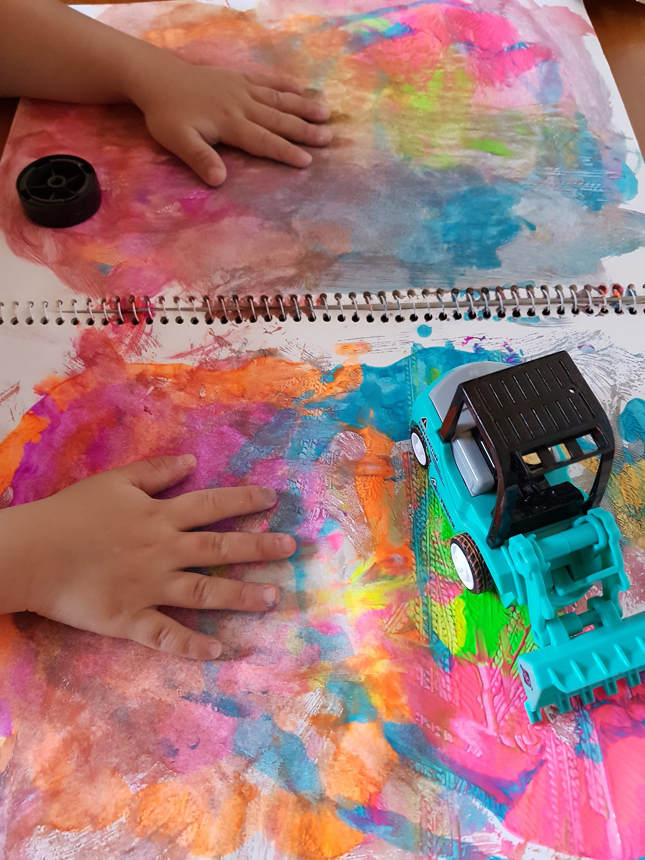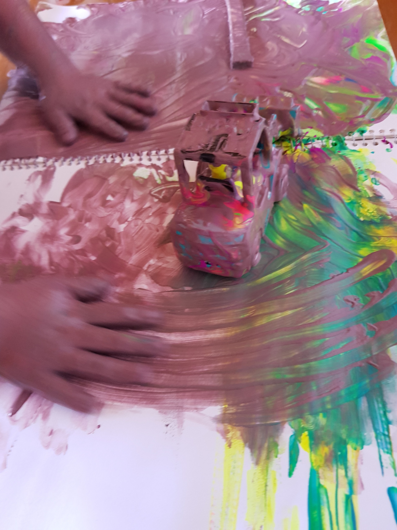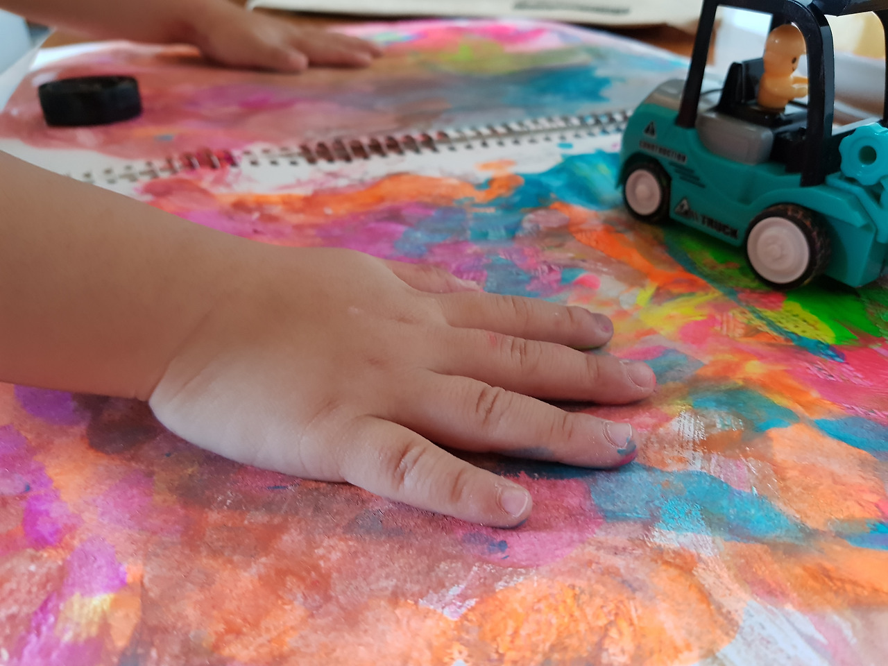 물감으로 범벅이 된 아이의 손과 자동차, 아이의 스트레스 풀리는 소리가 들려왔다.