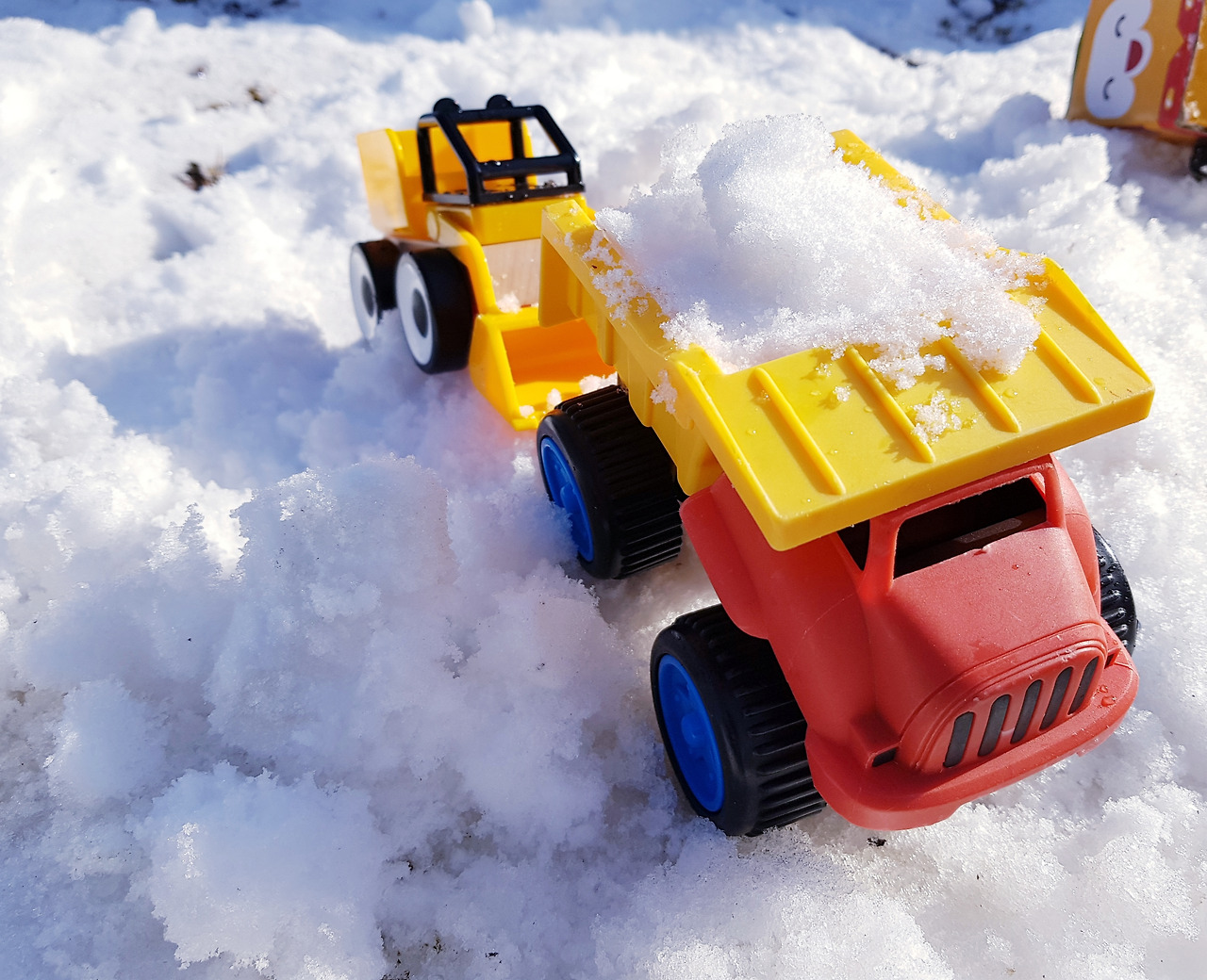 정원 한 켠에서 아직 녹지 않는 눈을 가지고 신나했던 아이의 제설차 놀이