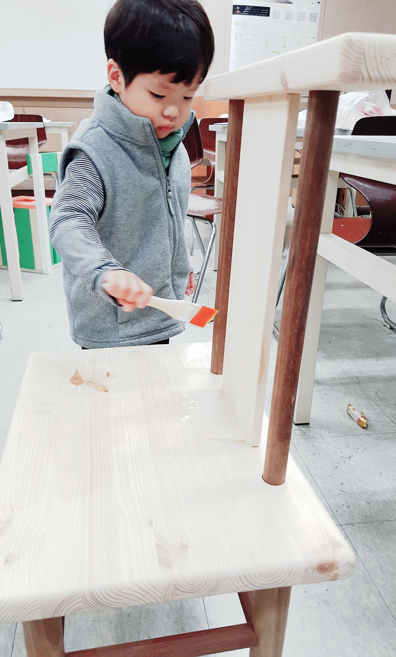가구디자인 수업에 엄마와 함께 참여했다. 아이를 위해 엄마가 직접 만든 의자에 오일을 바르는 모습