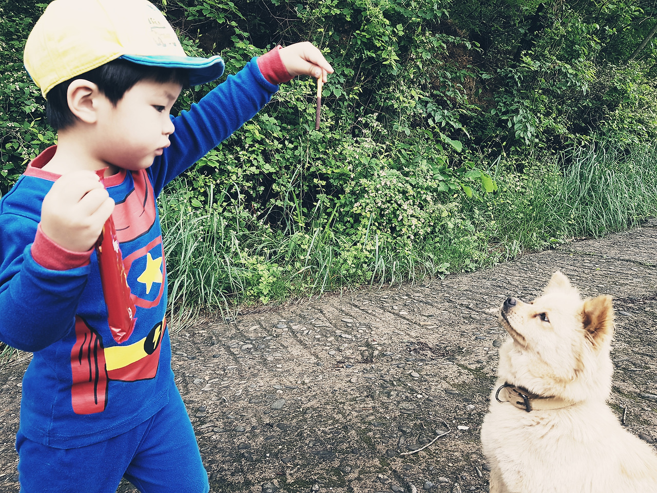 산책을 가기 전 준비하는 것은 걷는 즐거움을 배가하는 간식, 아이는 그 스스로 동생이라 부르는 김빠방과 함께 걷고 나누어 먹습니다. 짧은 산책이지만 걷고 나서 먹으면 꿀맛입니다.