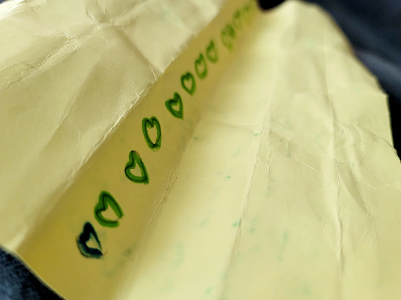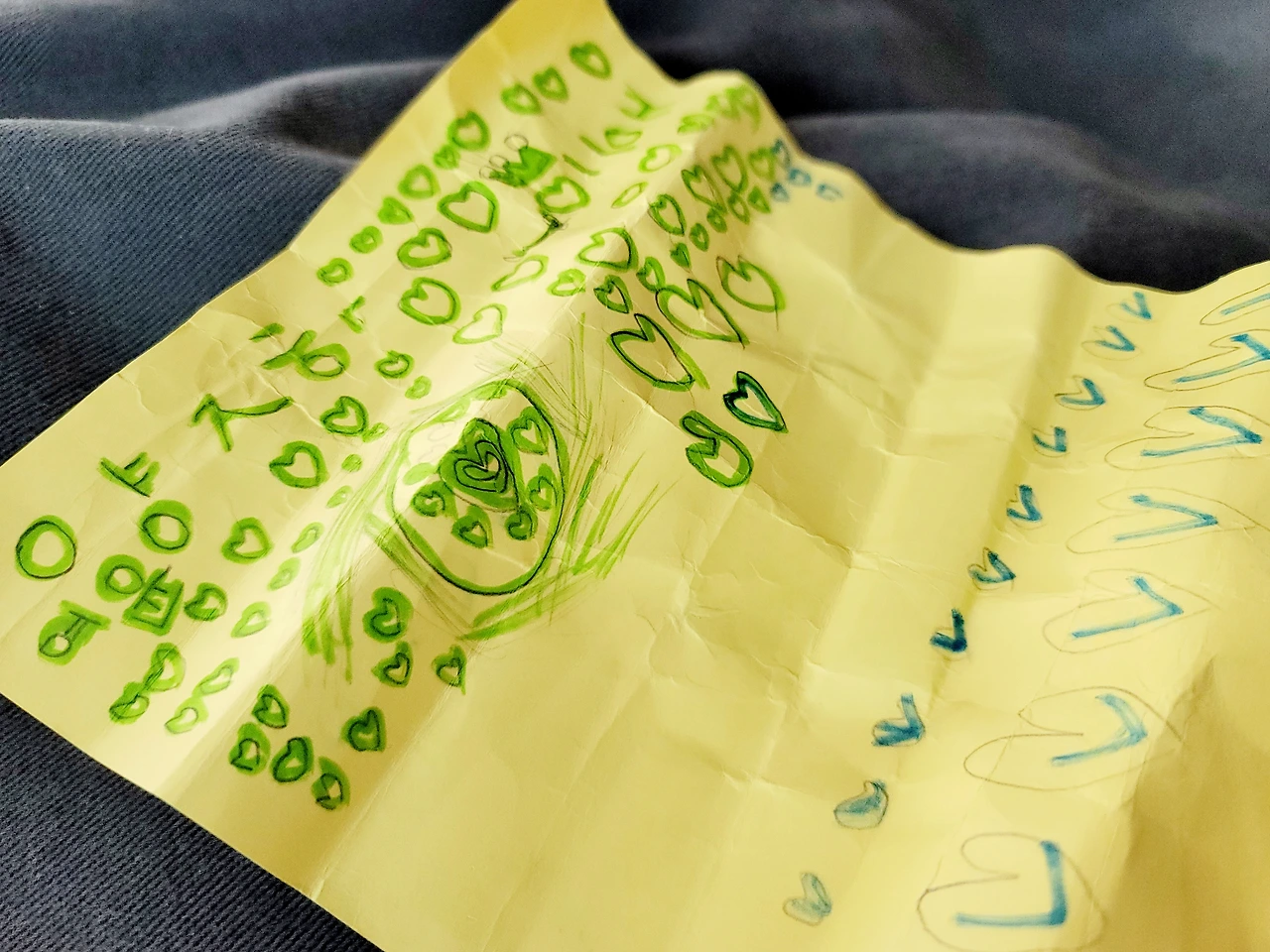 "아이다운 표현이다"라고 한 지인분은 말씀하셨다. 그렇듯 목장길 산책에서 느낀 감동이 다 가시기도 전이었다. 이튿날 아이의 유치원 가방에서 노란색 쪽지를 발견했다. 꼬깃꼬깃한 종이를 펼치며 옆에 있는 아이에게 물었다.