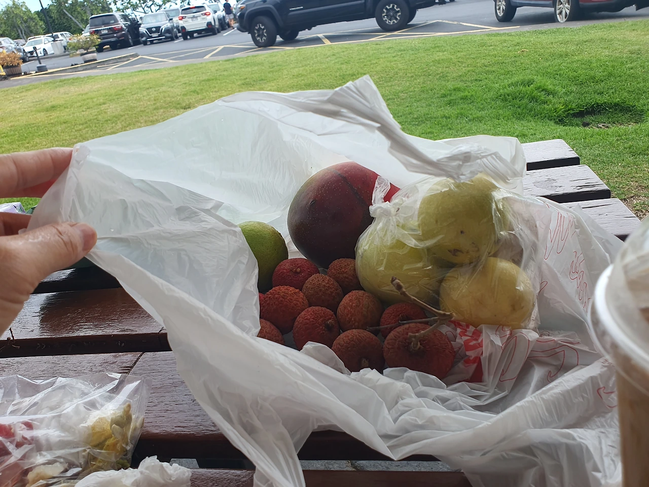 큰 망고 하나 7달러, 익다 만 릴리코이 네 개 들은 한 봉지 6달러, 라이치 10개쯤(내가 직접 괜찮은 거 골라 넣음) 9달러. 모두 합쳐 22달러. 에누리 안 해주시던 사장님인데 20달러에 해주신다. 오오~
