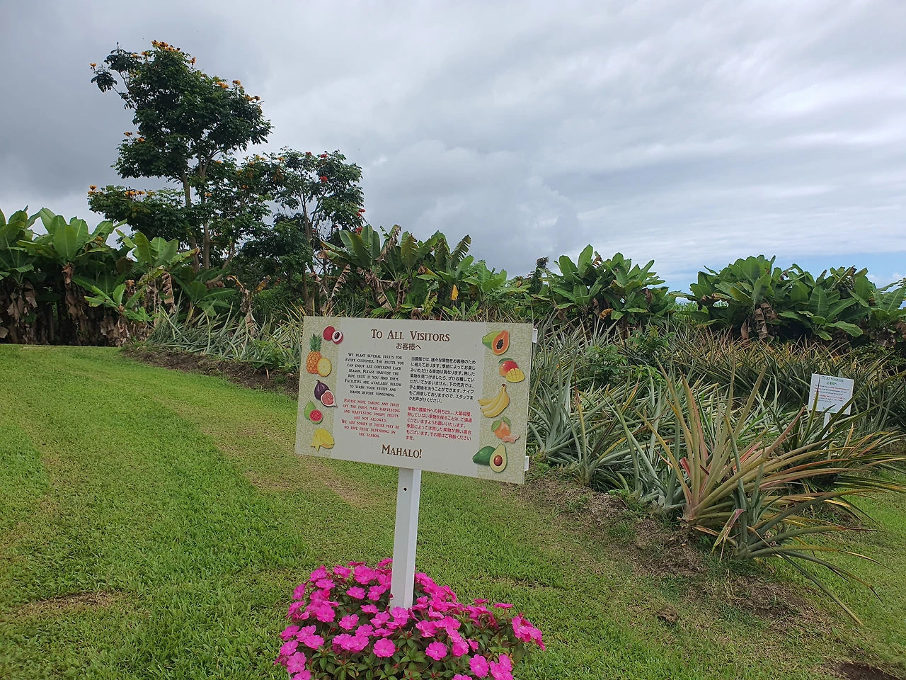 파인애플이 탐스럽게 자란 곳에도 푯말이 있었다. 같은 푯말인 줄 알고 읽지도 않고 한놈 큰 거 따왔는데 알고 보니 안된다고 써놨던 거였다. 작년에는 파인애플을 따도 됐어서 맘 편히 따버린 내 잘못이었다. 직원들은 친절하게, 기분 상하지 않도록 예쁘게 말하고 파인애플을 거둬갔다.