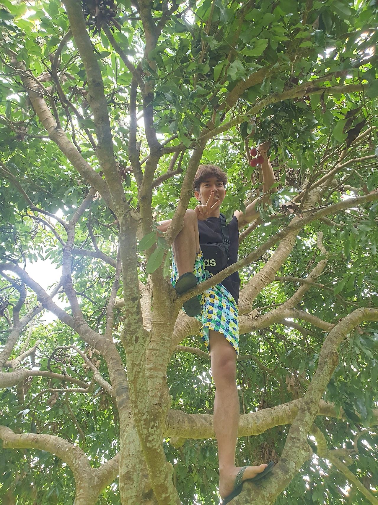 남편과 나는 라이치 나무 아래서 유심히 쳐다보다가 조금 높은 곳에 달린 열매가지들을 발견했고, 남편을 그대로 올려 보냈다. 허락까지 받았겠다 여섯일곱 개는 가져가도 될 것 같았다.