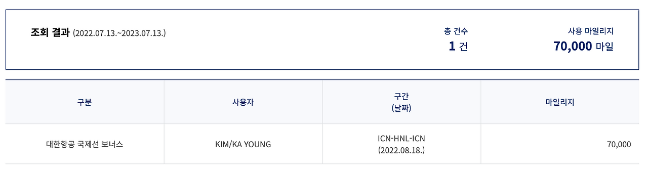 대한항공 이코노미 기준 인천-와이키키 왕복 마일리지는 70000이고 내 보유 마일리지는 150000정도기 때문에 거뜬히 가능했다.