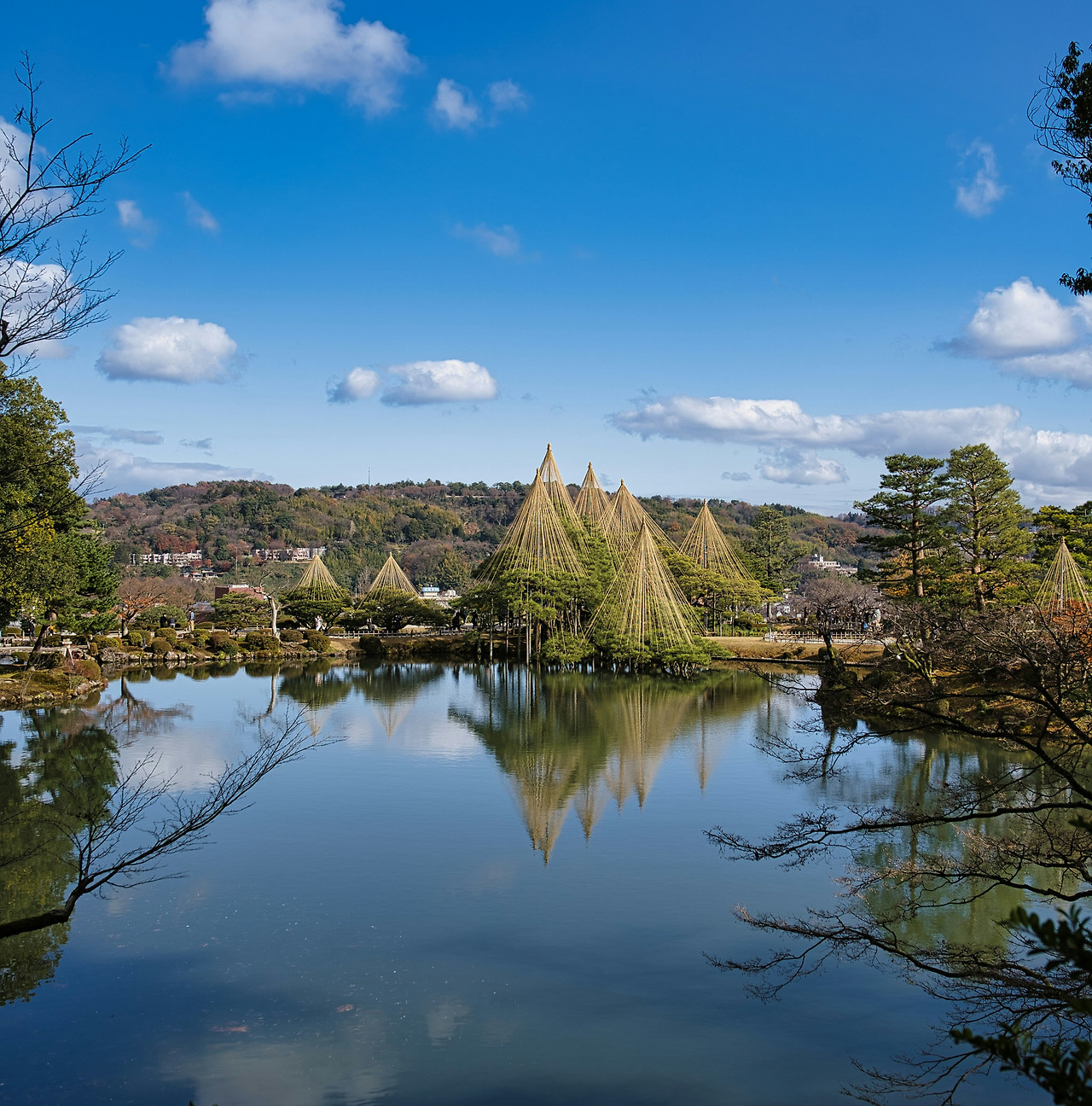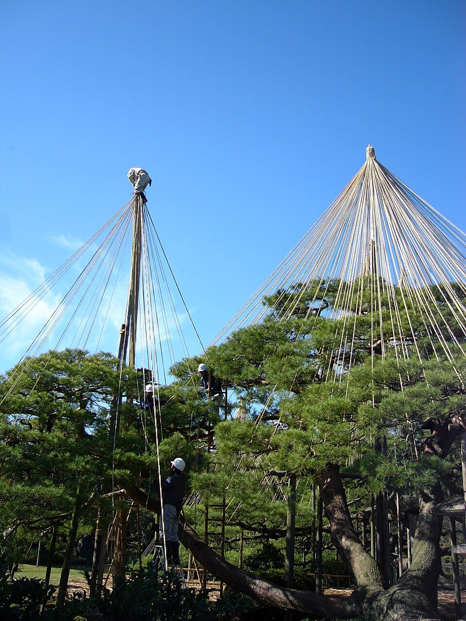 정원을 걷다 보니 멀리 원뿔 모양의 구조물들이 눈에 들어왔다. 마치 천장이 뾰족한 작은 움막 같았는데, 알고 보니 겨울철 눈의 무게로 나뭇가지가 부러지지 않도록 받쳐주는 ‘유키즈리(雪吊り)’였다. 밧줄을 원뿔 형태로 엮어 가지를 지탱하는 방식인데, 기능을 넘어 하나의 풍경이 된다. 겐로쿠엔의 유키즈리는 규모와 아름다움 면에서 특히 유명하다고 한다.