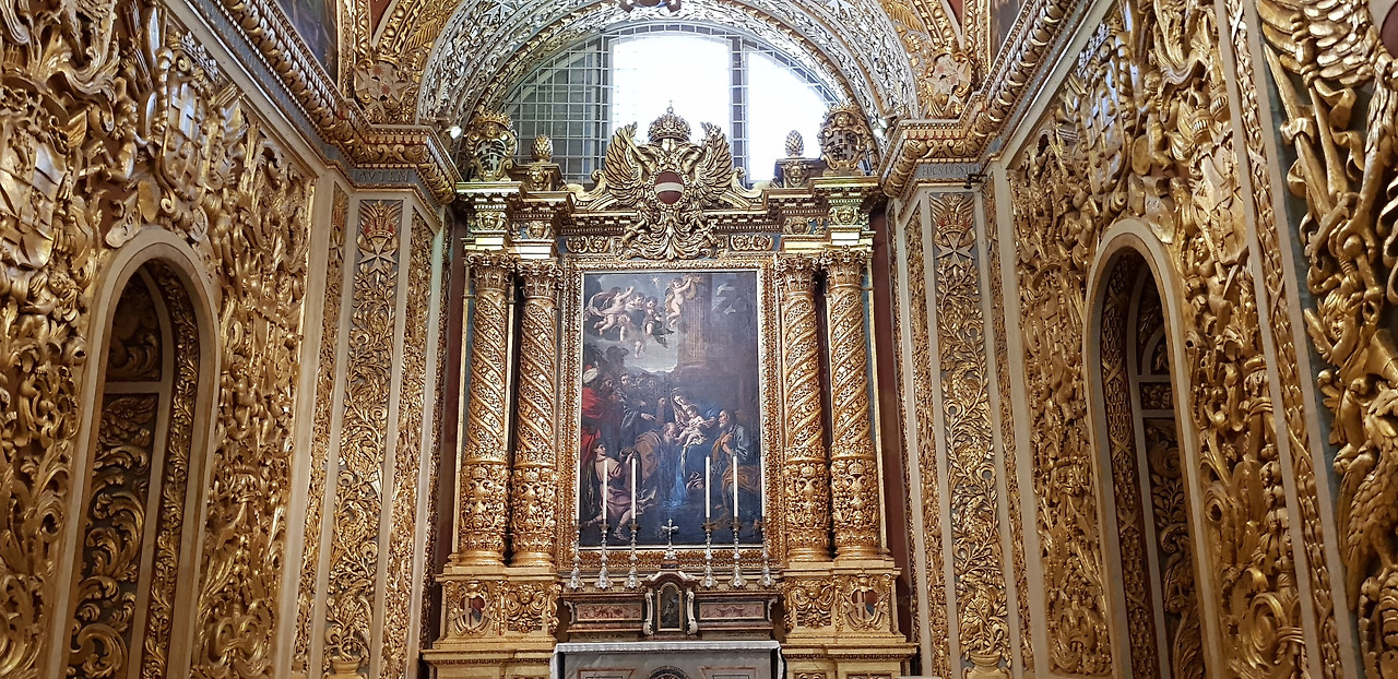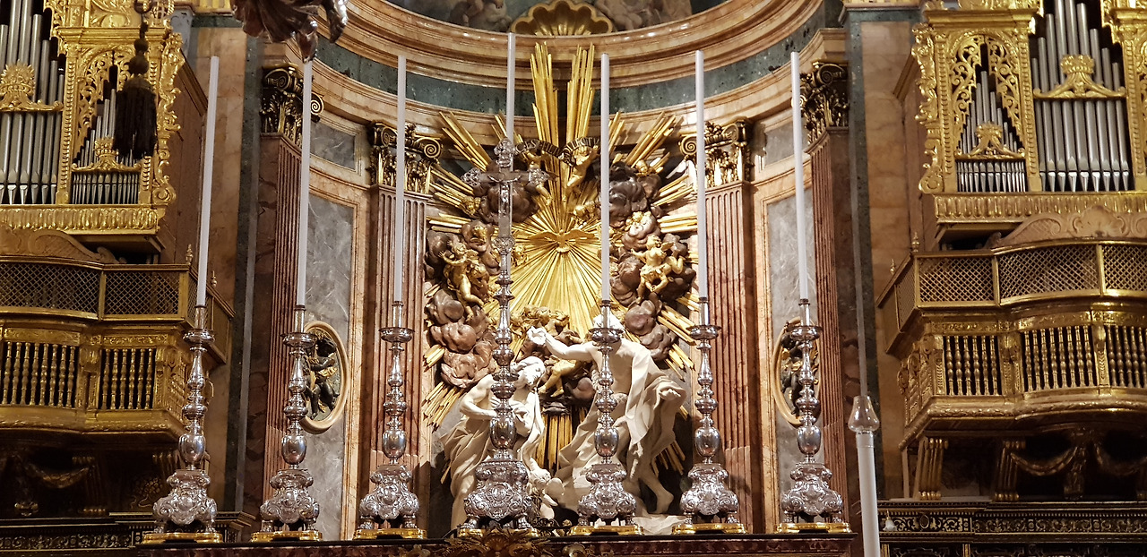 벽과 기둥, 천장까지 온통 황금빛으로 빛나는 공간. 대리석 바닥을 포함해 성당 전체가 바로크 양식의 장식으로 빼곡히 채워져 있다. 부조 하나하나에 금을 입힌 듯한 화려함은, 그야말로 눈부시다는 표현이 어울렸다.