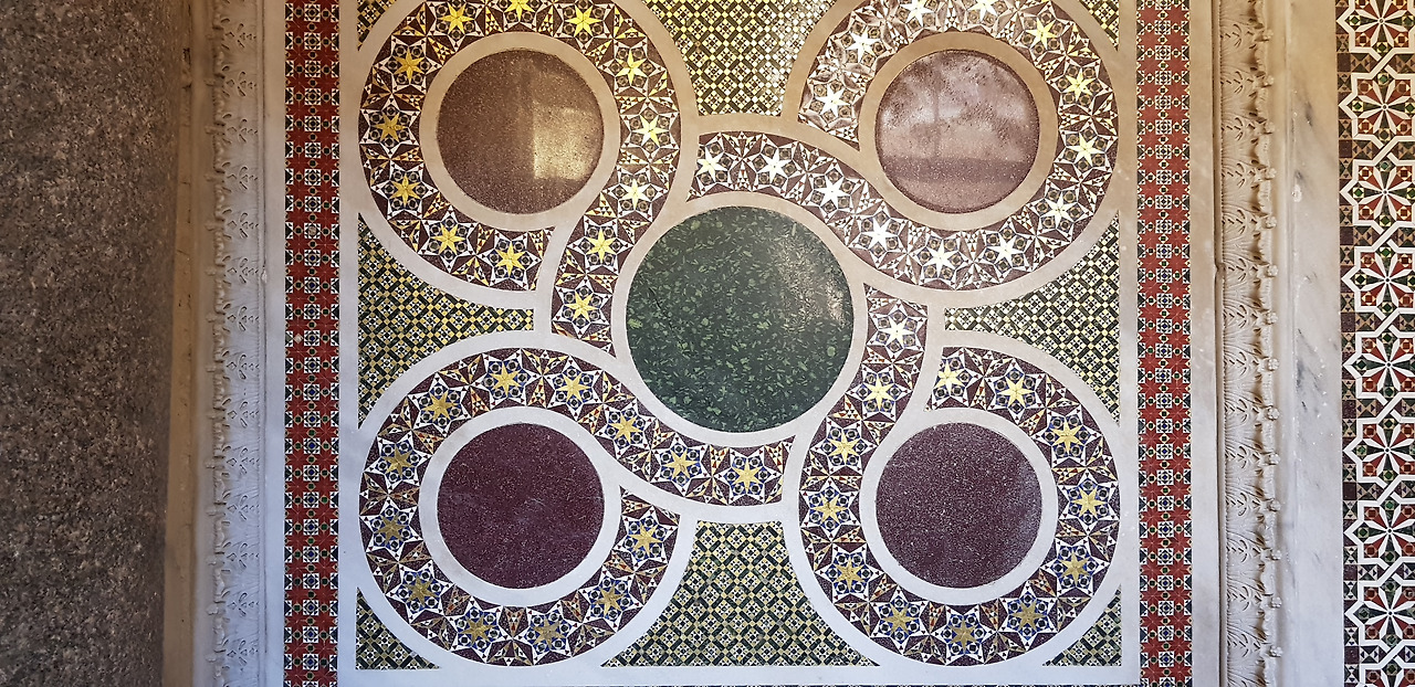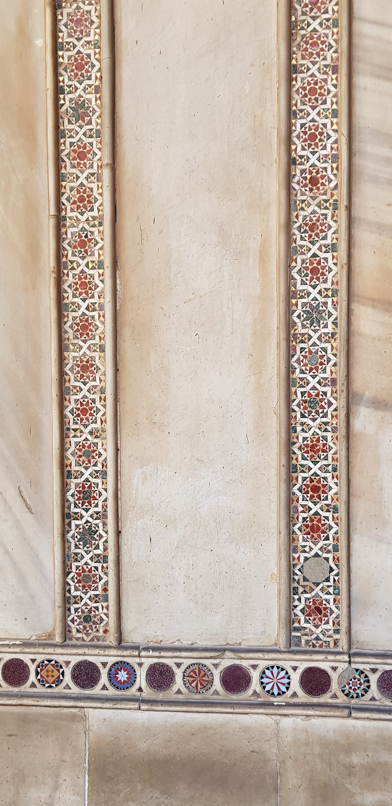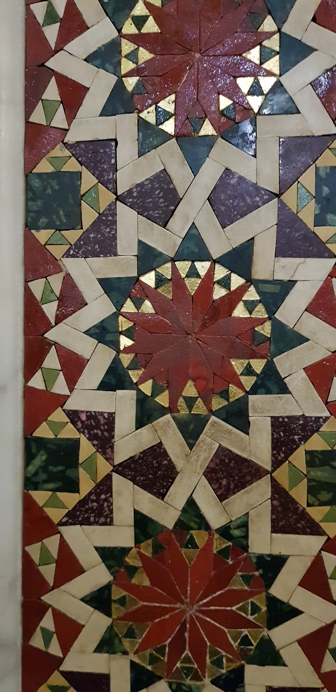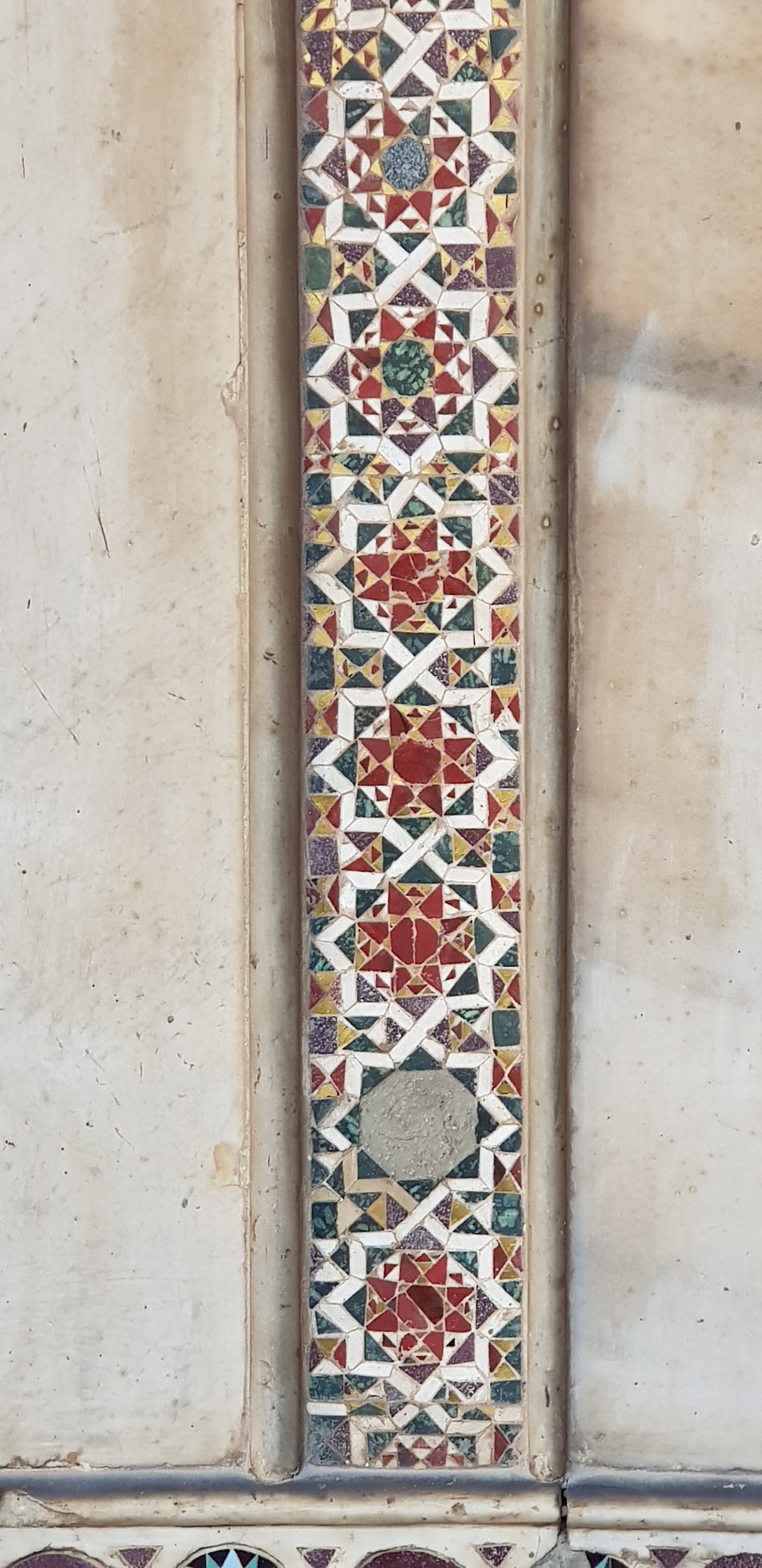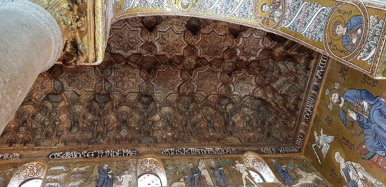 아랍풍의 벌집 모양 목재 천장과 기하학적 무늬의 바닥 타일은 벽면의 황금 모자이크와는 또 다른 양식이다. 그러나 서로 다른 문화와 양식이 충돌하지 않고, 조화롭게 어우러져 있었다.