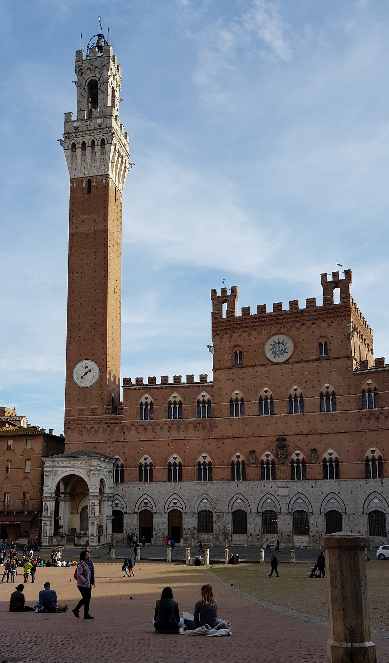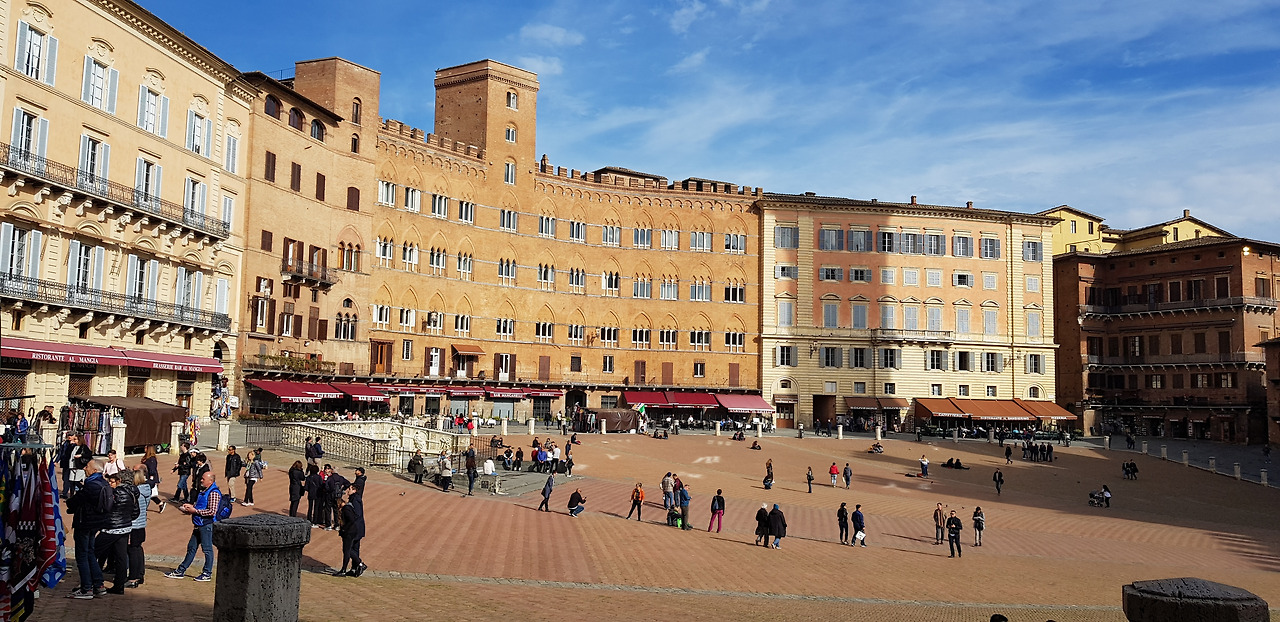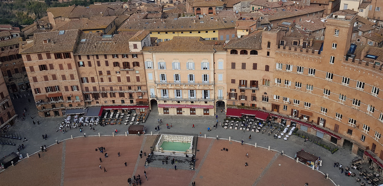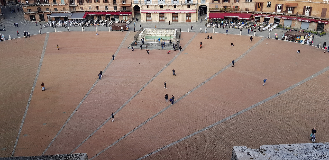 그람시 광장에서 몬타니니 길을 지나 반치 디 소프라 길을 따라 10분 남짓 걸어 올라가자, 시에나의 심장부인 캄포 광장(Piazza del Campo)이 모습을 드러냈다. 13세기말, 재래시장이 있던 자리에 조성된 이 광장은 아홉 개의 부채꼴 구획으로 나뉘어 있고, 한쪽으로 완만하게 기울어져 있다. 이는 시에나를 통치했던 9인 위원회를 상징한다.