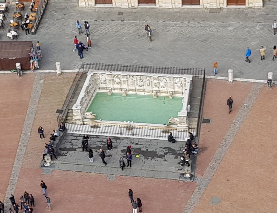 광장 위쪽에는 대지의 여신을 기리는 가이아의 분수(Fonte Gaia)가 자리하고 있다. 14세기 중반부터 시민들의 식수를 공급해 온 이 분수는 복제품이며, 원본은 산타 마리아 델라 스칼라 박물관에 보관되어 있다.