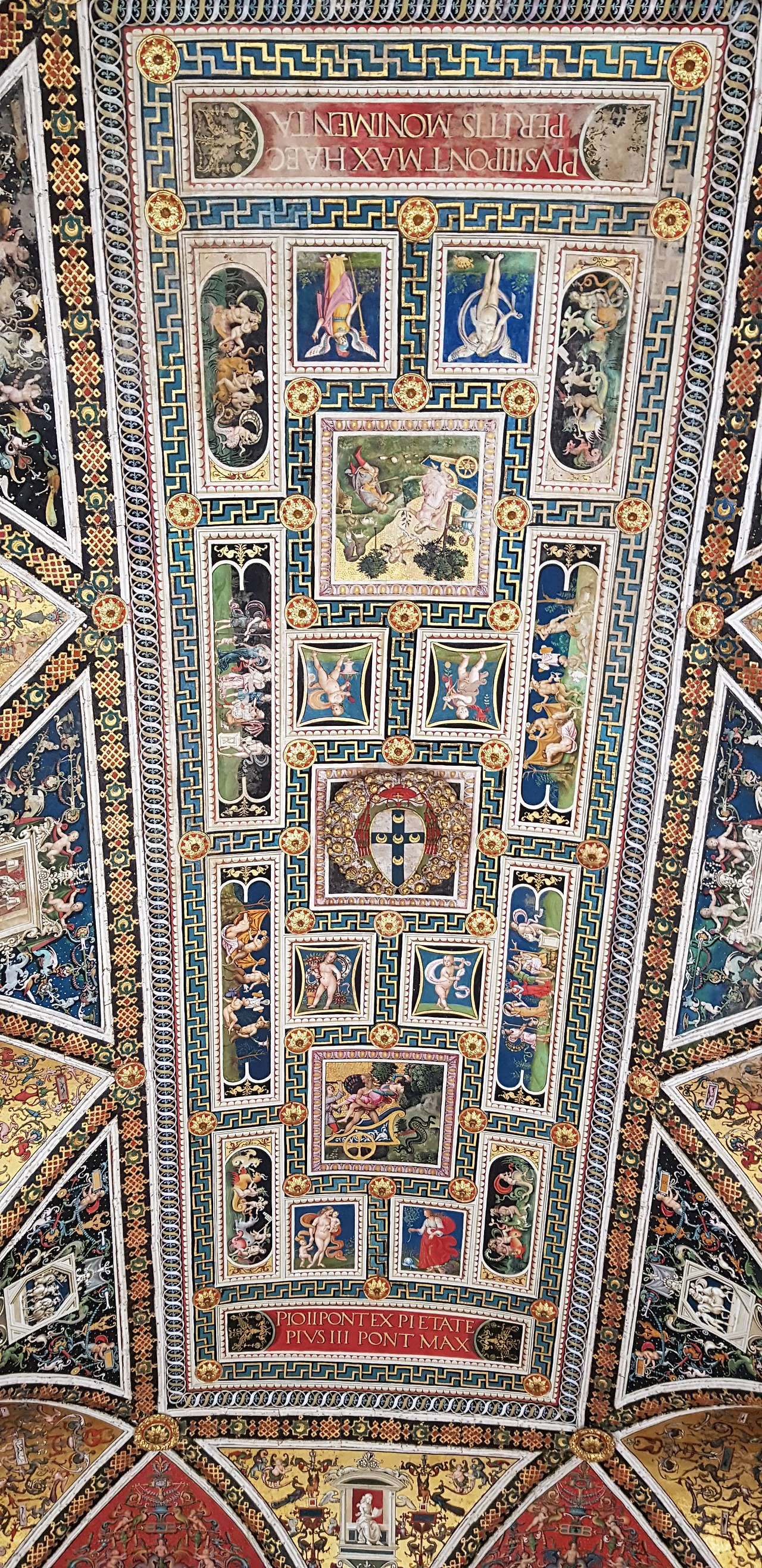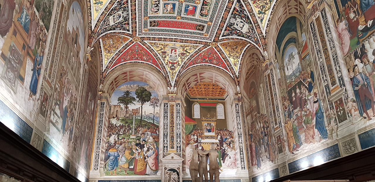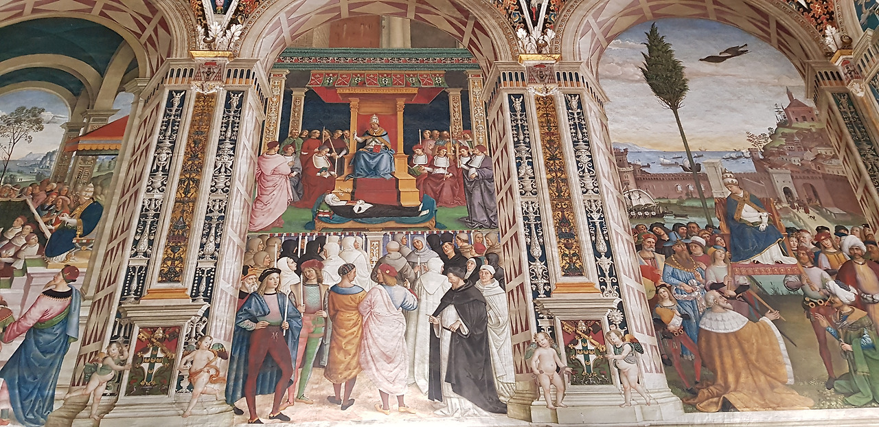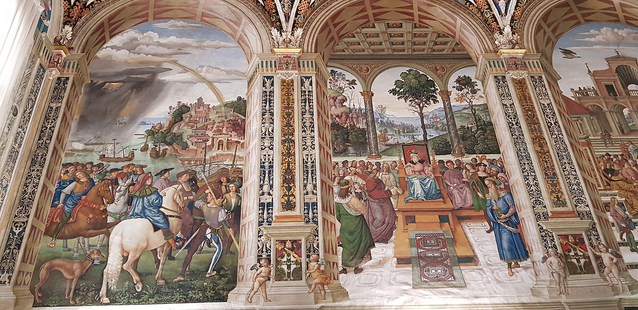 성당 옆의 피콜로미니 도서관은 ‘찬란하다’는 말이 어울리는 공간이다. 화사한 프레스코화들이 색채와 이야기로 눈길을 사로잡았다. 천장에는 신화를 소재로 한 프레스코화가, 벽에는 피콜로미니의 주요 행적을 그린 프레스코화가 벽을 가득 채우고 있었다. 움브리아 예술가 핀투리키오의 작품이다.