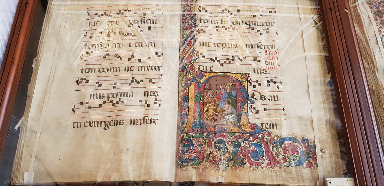 벽화 아래에는 손으로 직접 그린 찬송가 악보들이 전시되어 있다. 이 악보에도 화사한 색깔의 성화가 그려져 있다. 이 방은 그 자체로 하나의 예술 작품이었다.