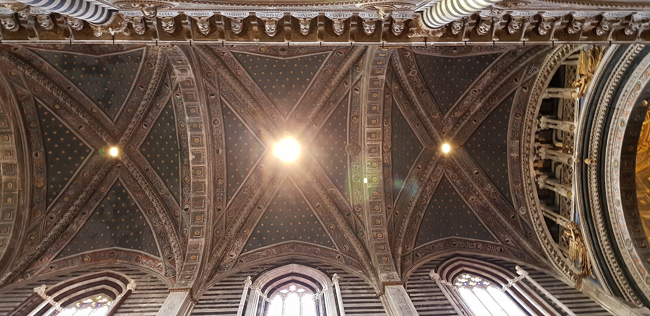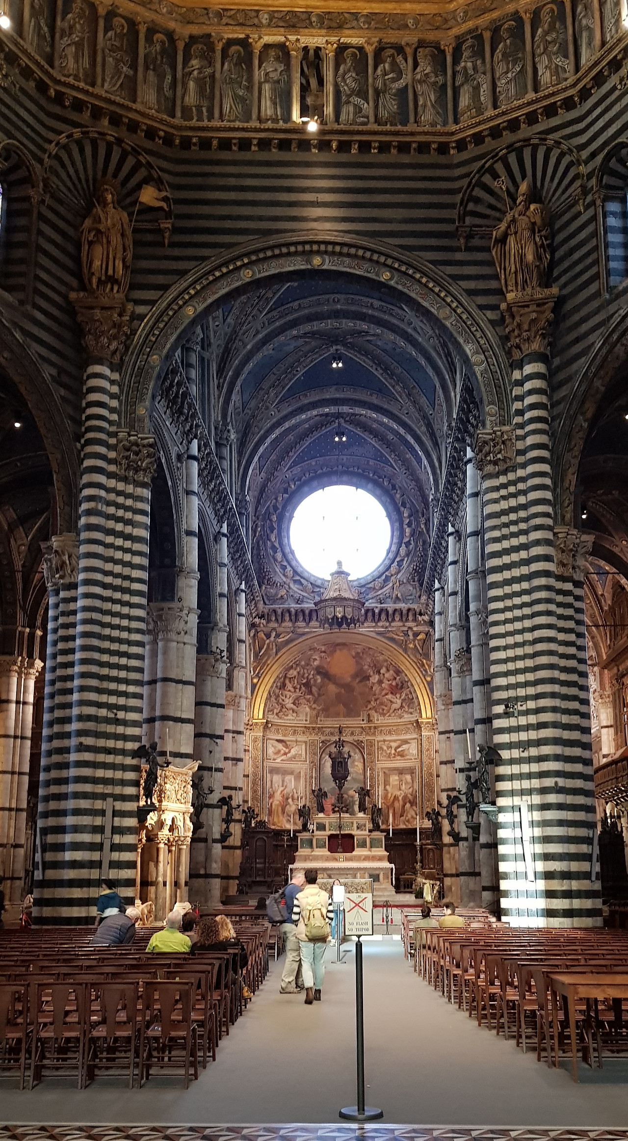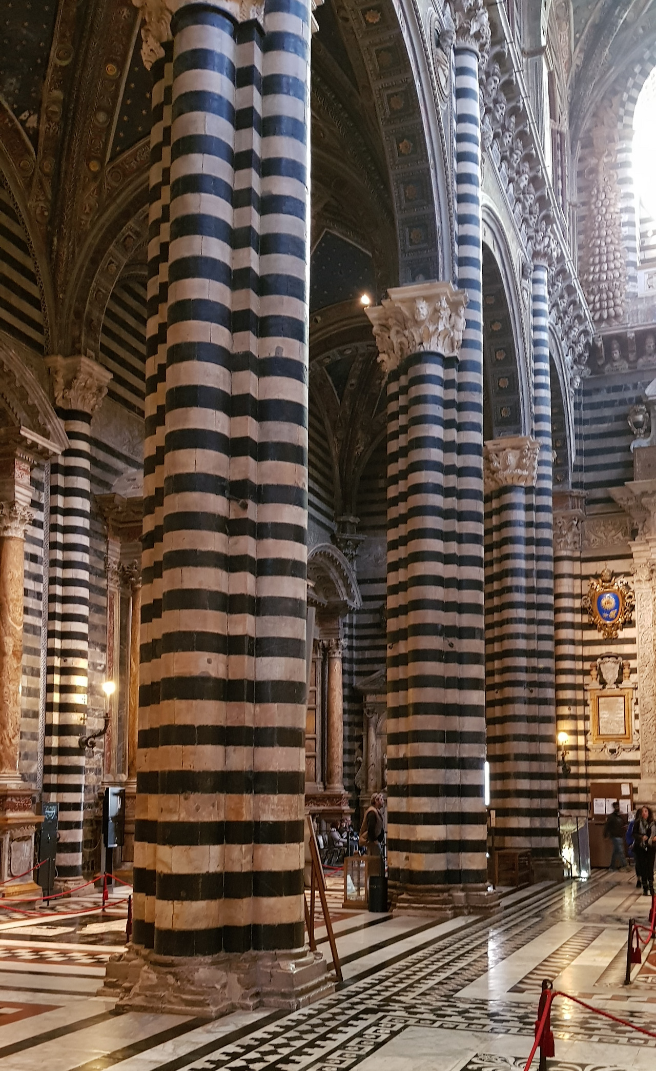 성당 내부에 들어서자 흑백 가로줄 무늬의 기둥들이 시선을 압도한다. 이 색채는 시에나의 상징이다. 로물루스와 레무스의 후손이 흑마와 백마를 타고 도시를 세웠다는 전설에서 비롯되었다고 한다.