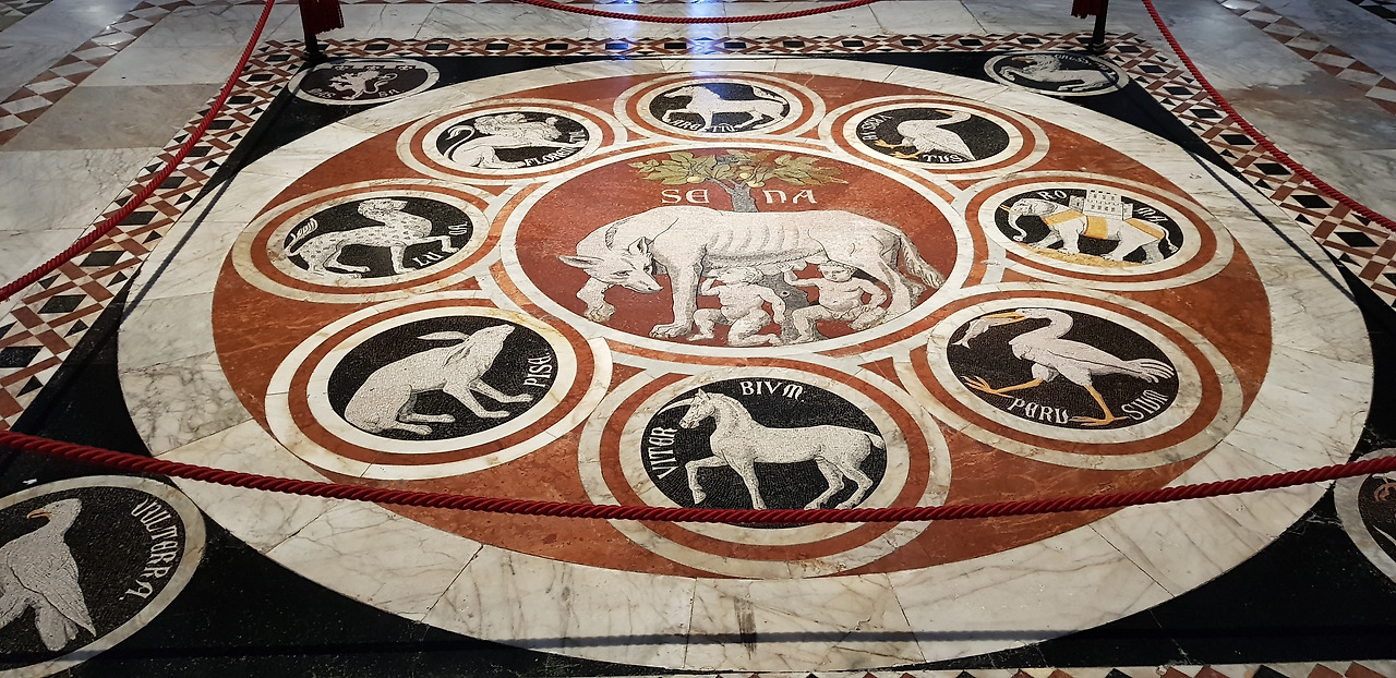 바닥에는 만화처럼 흥미로운 대리석 상감 모자이크가 가득 그려져 있다. 늑대에게 젖을 먹는 로물루스와 레무스도 여기서 다시 만난다.