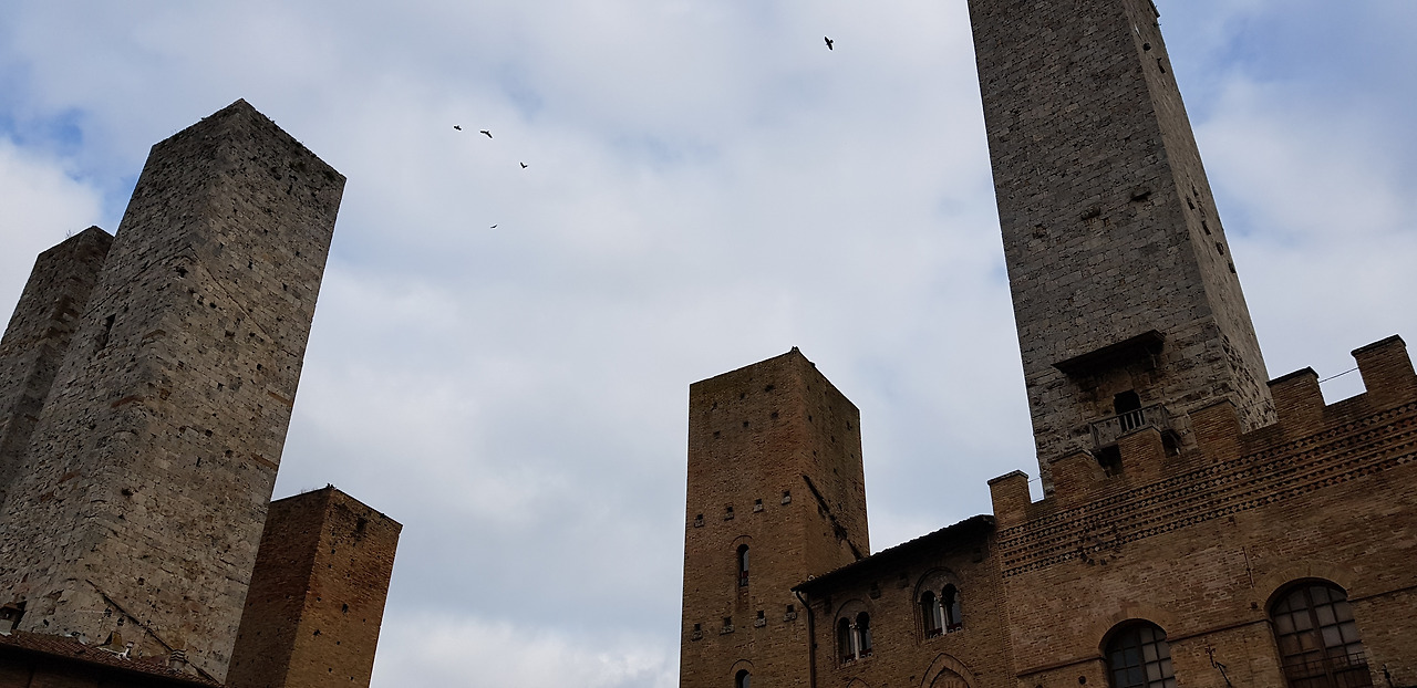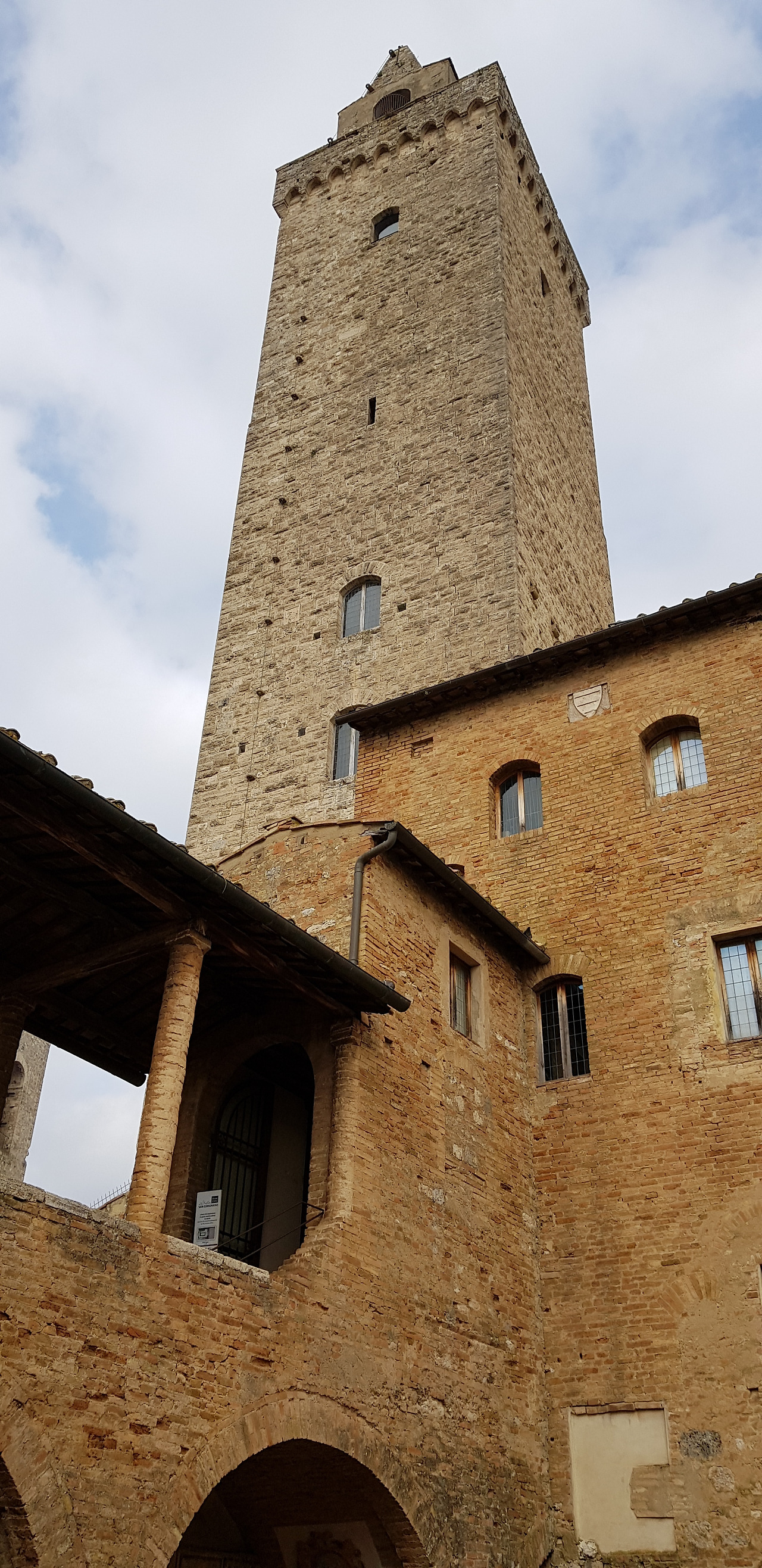 11~13세기 전성기에는 귀족들이 부와 권력을 과시하기 위해 경쟁적으로 탑을 세웠다. 한때 72개의 탑이 하늘을 찔렀고, 가장 높은 것은 70m를 넘었다고 한다. 과열된 경쟁을 막기 위해 의회는 포폴로 궁(Palazzo del Popolo)의 그로사 탑(Torre Grossa) 보다 높게 짓지 못하도록 법으로 제한했다. 지금은 14개 남짓만 남아 있지만, 여전히 ‘중세의 맨해튼’, ‘탑의 도시’라는 별명은 유효하다.