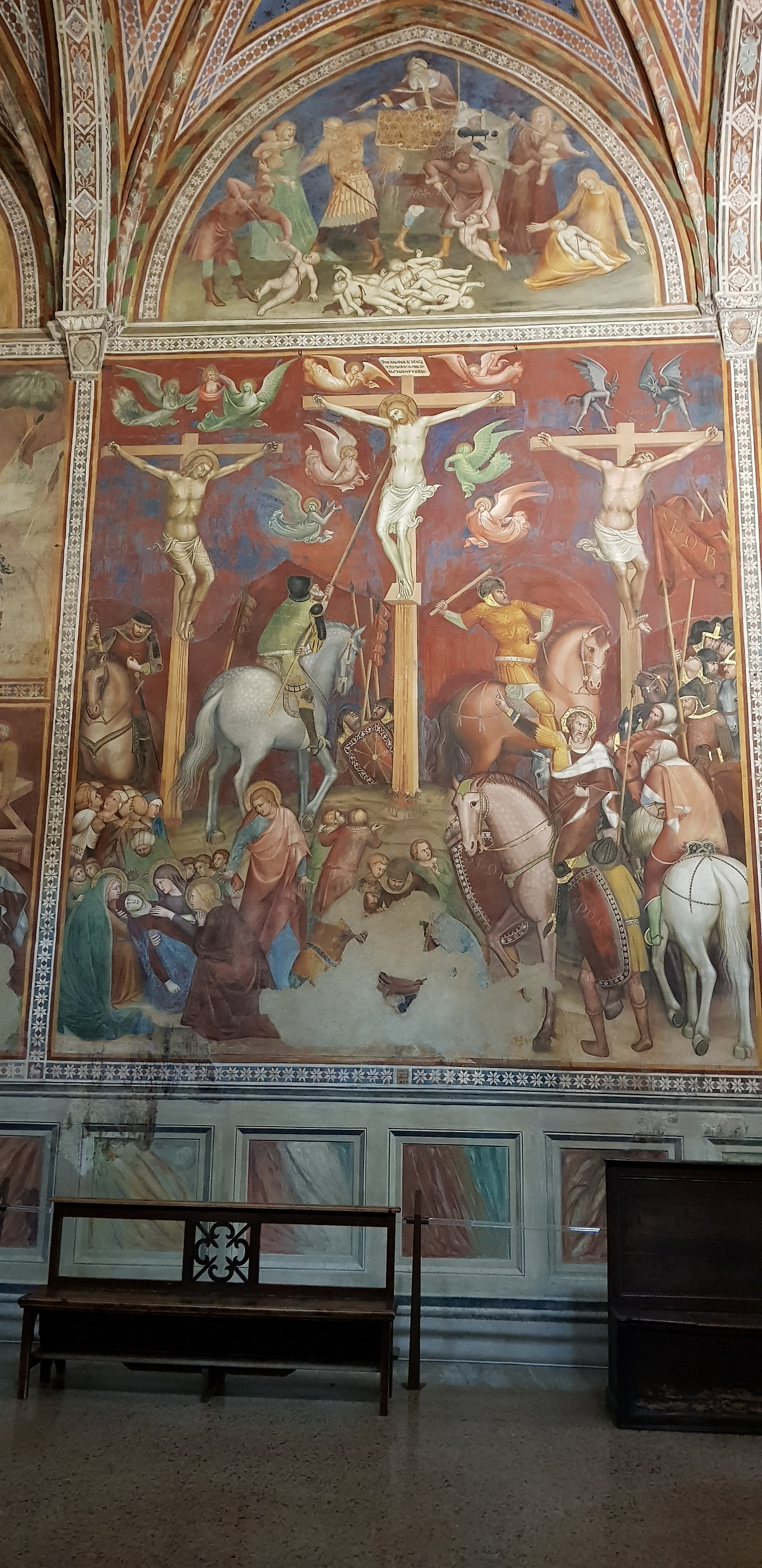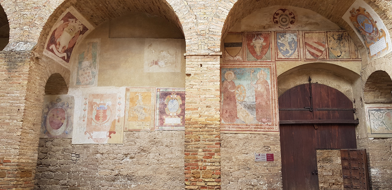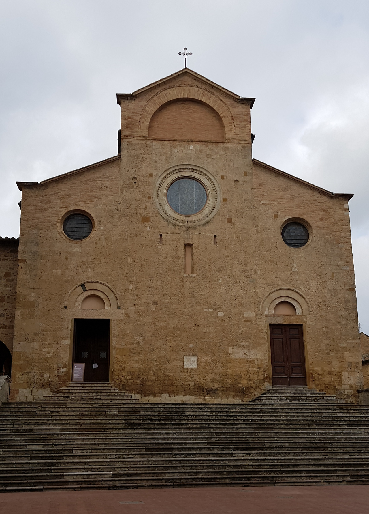 두오모 광장에 자리한 산타 마리아 아순타 대성당(Collegiata di Santa Maria Assunta)은 12세기 중엽에 세워졌다. 외관은 장식 하나 없이 소박하지만, 내부로 들어서면 분위기가 완전히 달라진다. 14세기 시에나 파 화가들이 성서 이야기를 담아 그린 프레스코화가 벽면을 가득 채우고 있다. 타데오 디 바르톨로의 〈최후의 심판〉과 〈천국과 지옥〉, 베노초 고촐리의 〈성 세바스찬의 순교〉, 도메니코 기를란다요의 〈성 요한 세례당의 수태고지〉가 이어진다.