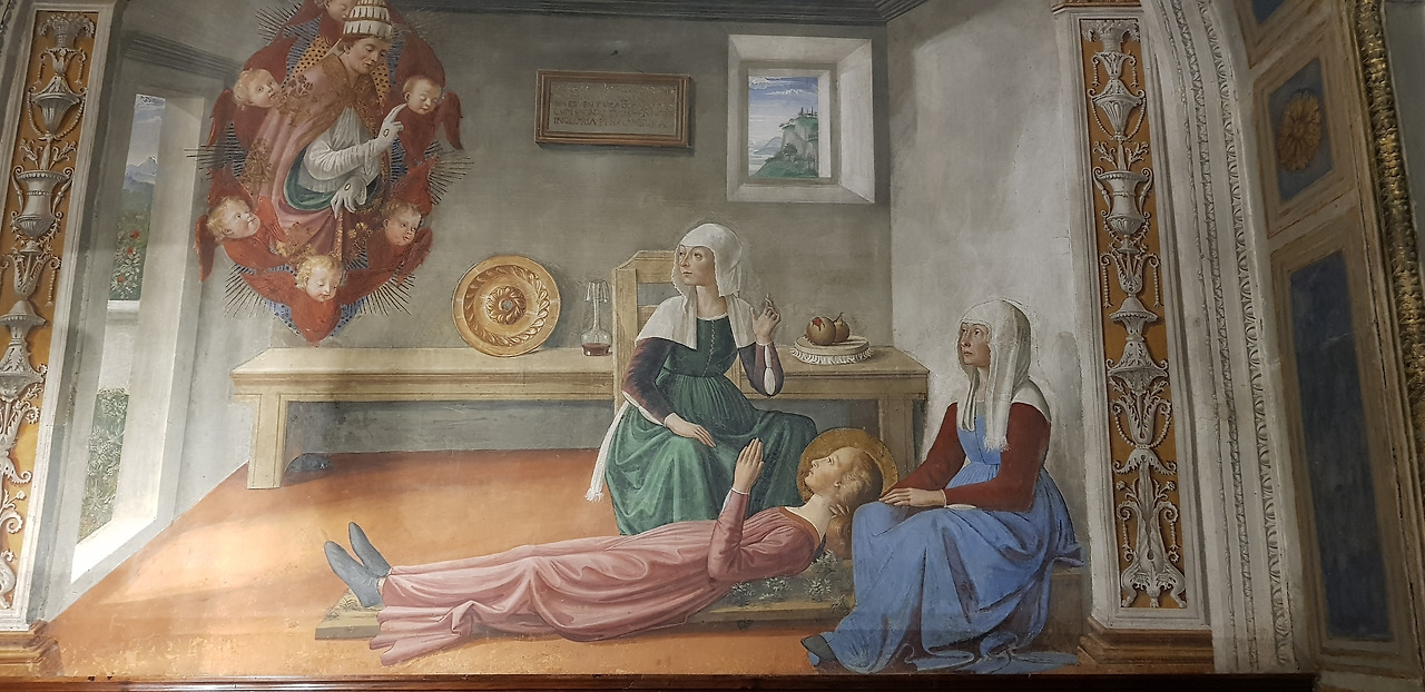 이곳 사람들은 공식 수호성인인 성 제미니아노뿐 아니라, 산지미냐노에서 태어난 성녀 피나(Santa Fina)도 깊이 공경한다. 열 살에 병으로 마비된 채 나무판자 위에서 생을 보낸 성녀 피나. 열다섯 살에 숨을 거두던 날, 종이 저절로 울리고 탑과 벽에 제비꽃이 피었다는 전설이 전해진다.