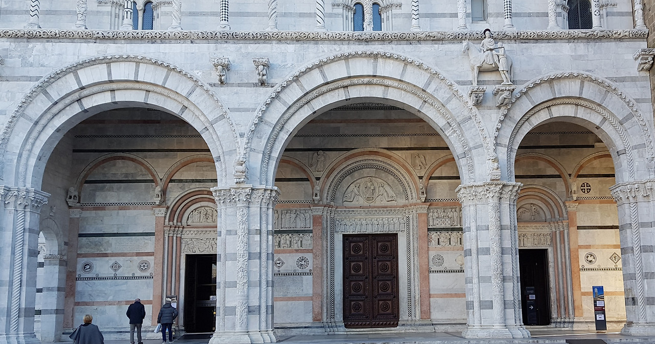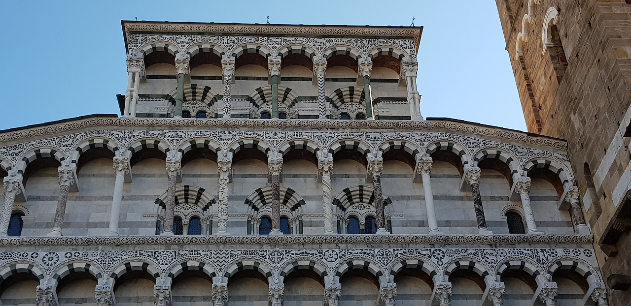 흰색과 회색, 분홍빛 대리석이 어우러진 파사드는 섬세하면서도 화려하다. 상단 아치의 기둥들은 하나같이 서로 다른 표정이다. 아레초에서 보았던 산타 마리아 델라 피에베 성당이 떠올랐다.