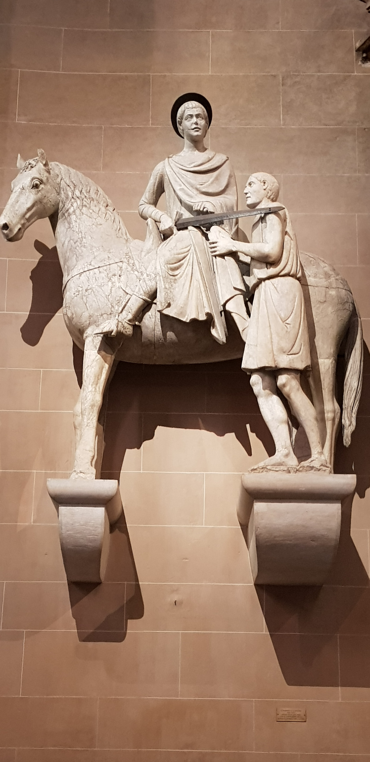 중앙 아치 오른쪽 위에는 망토를 반으로 잘라 거지에게 나누어 주는 〈산 마르티노의 기마상〉이 자리하고 있다. 이 기마상은 모작이고, 진품은 성당 내부에 보관되어 있다.